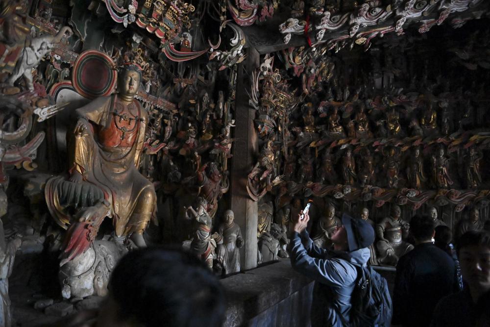 10月5日,游客在山西省长治市潞州区的观音堂参观。观音堂始建于明万历年间,其正殿内现存彩塑约500尊,具有极高艺术价值。新华社记者 杨晨光 摄