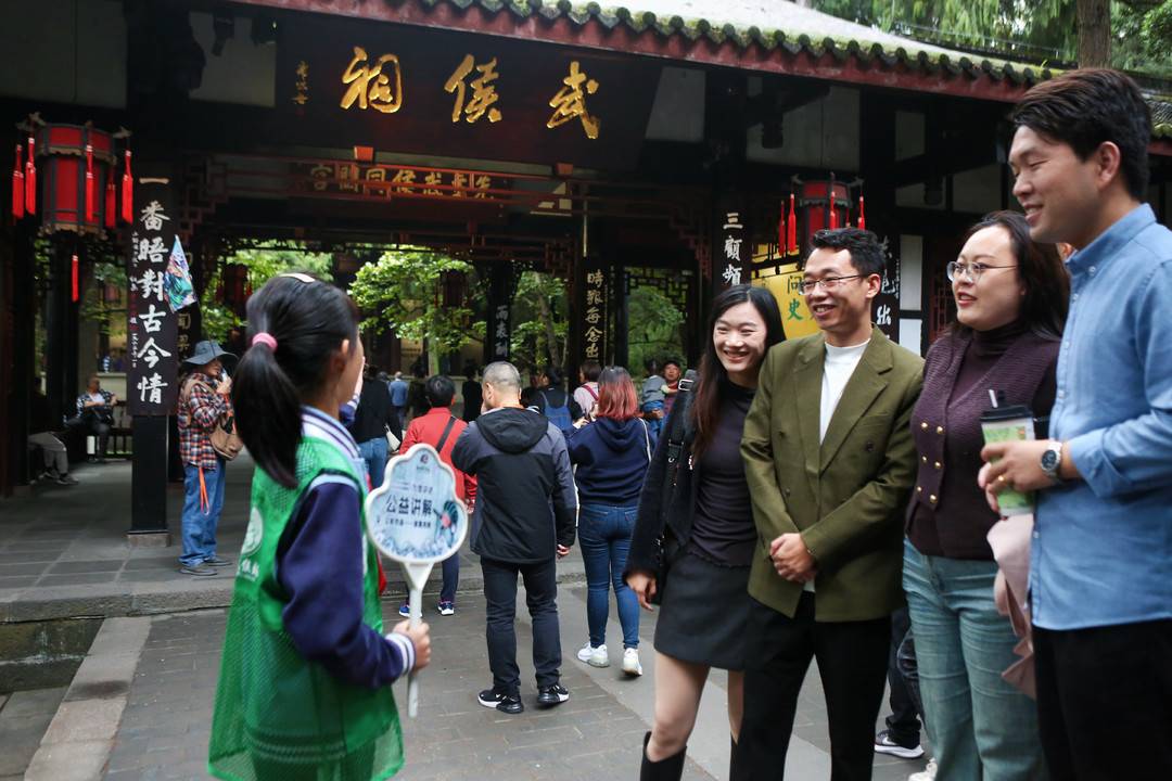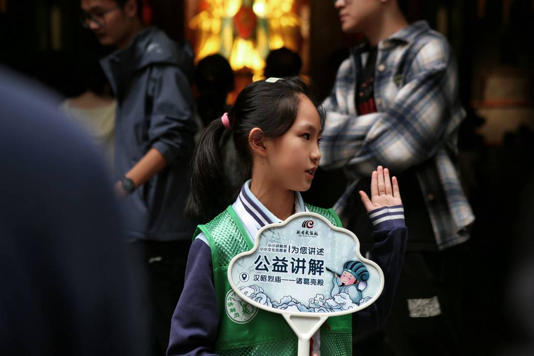 在刚过去的国庆假期,来到古柏森森、青瓦红墙的成都武侯祠博物馆中,你会发现此处游人如织,摩肩接踵,一派热闹的景象。此时,倘若屏声敛息,就能听到从喧嚣人群中传来清晰而流畅的讲解声。细听之下,这声音还带着些许稚嫩感,却从容不迫,妙语连珠。循着声音走进人群一看,只见一位不过小学年纪的女孩,正在游人的簇拥之中,将三国历史文化娓娓道来。