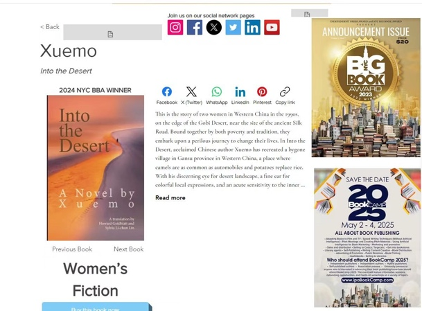 日前,美国纽约市大书奖组委会公布了2024年纽约市大书奖(NYCBigBookAward)名单,其中由葛浩文、林丽君翻译的、雪漠原著小说《沙漠的女儿》获“女性小说类”金奖,该译本在2022年还因其“从语言和受众的角度适度加工,巧妙把握文学类翻译的创作空间,以通俗的话语表现原著的风格和内容,忠实原著而没有被字句所束缚,有助于美国读者理解中国人民不屈的奋斗精神”而获得中国外文局优秀翻译奖。