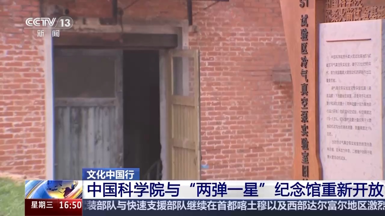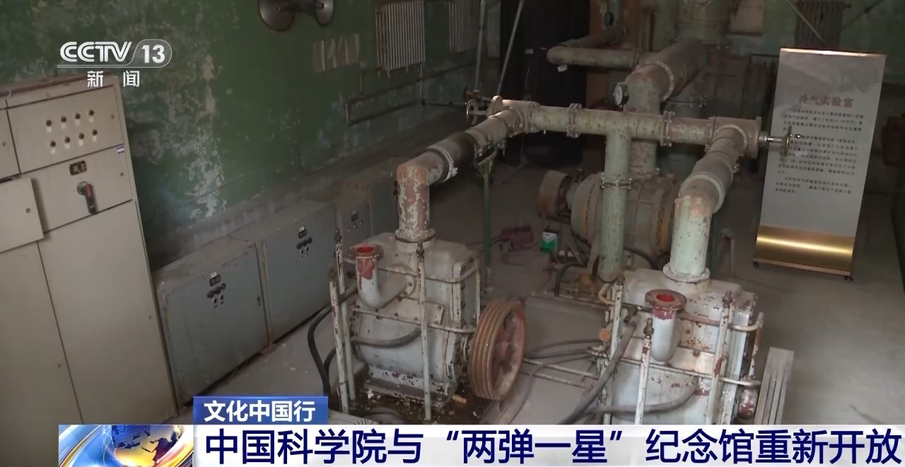 总台央视记者 任梅梅:中国科学院与“两弹一星”纪念馆所在的园区,其实是原来的怀柔火箭试验基地,在这里直到今天仍然保留了与“两弹一星”相关的真实试验场景,比如在我身后,就是一座冷气真空泵实验室,当时科研人员就是在这里进行氢氧火箭发动机的相关试验工作。