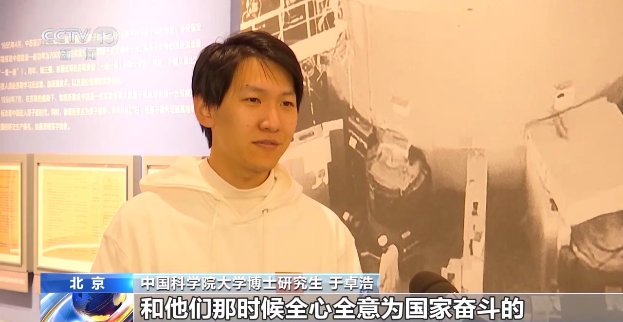 中国科学院大学博士研究生 于卓浩:深深地感觉到老一辈科学家们的不易和他们那时候全心全意为国家奋斗的精神。一代人有一代人的使命,一代人有一代人的担当,作为青年学子,我们更要将“两弹一星”精神在我们身上传承,让我们的奋斗转化为国家发展的蓬勃动能。