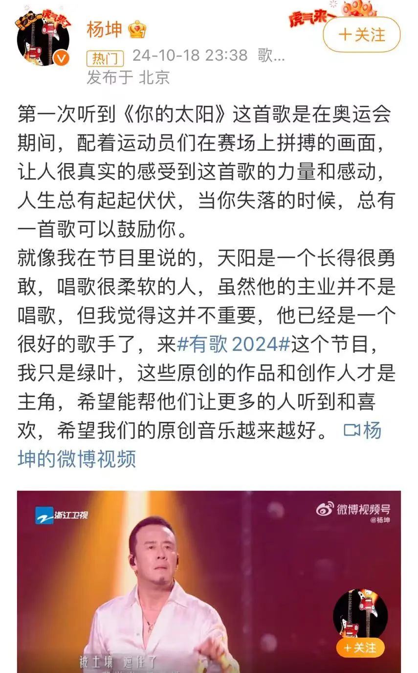 在综艺《有歌2024》第二期节目中一位名叫王天阳的普通职工和歌手杨坤一起唱了一首《你的太阳》引爆全场并在网上引发大量讨论