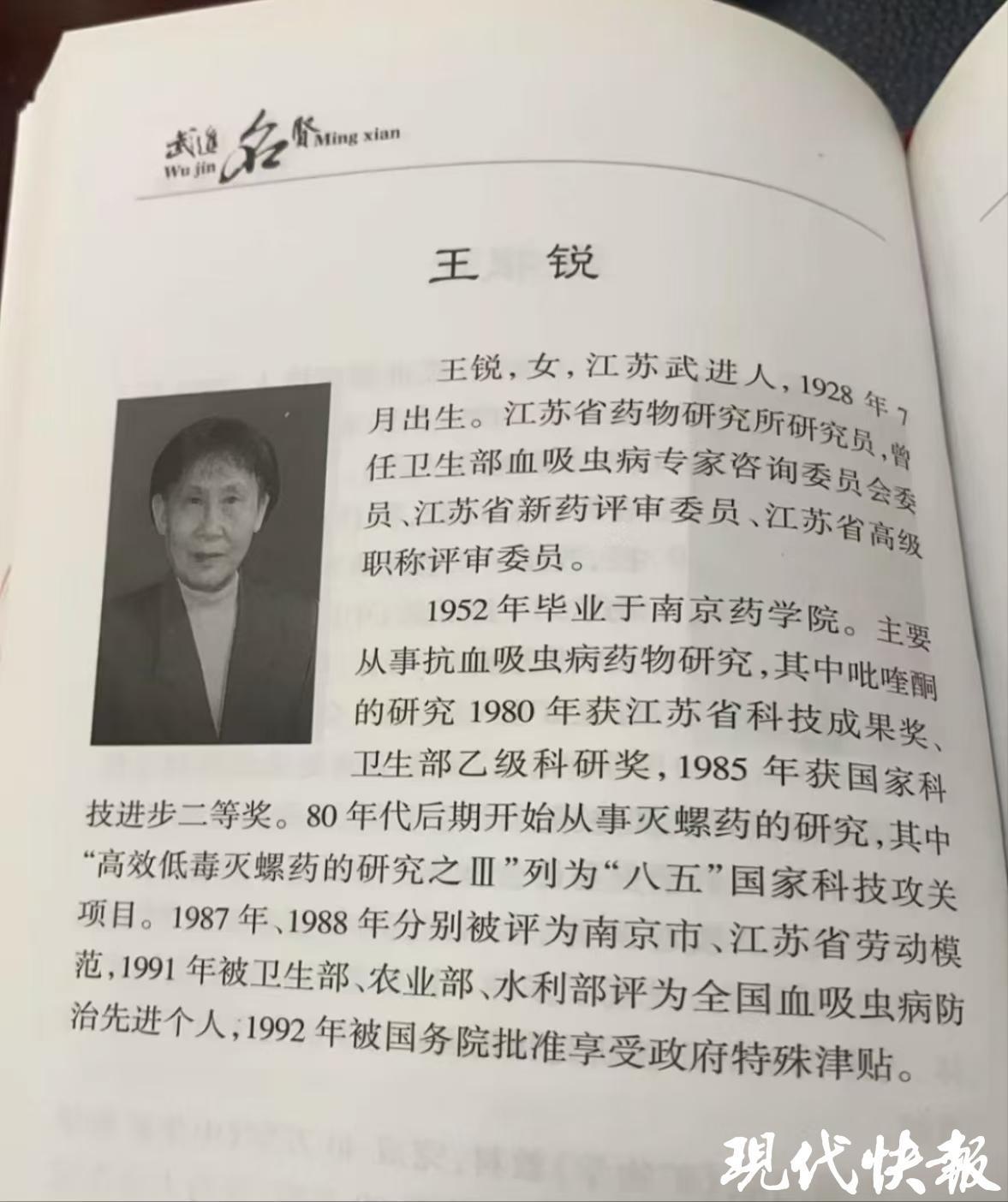 通过整理,冯女士发现,这些旧书及手稿属于一位名叫王锐的女性科学家。王锐是江苏武进人,1928年出生,曾任江苏省药物研究所研究员、卫生部吸血虫病专家咨询委员会委员、《中国血吸虫病防治杂志》第三届编委、江苏省新药评审委员、江苏省高级职称评审委员。1952年,王锐毕业于华东药学院(1956年改名为南京药学院、1986年与南京中药学院合并成为中国药科大学),主要从事抗血吸虫病药物研究,其中吡喹酮的研究1980年获江苏省科技成果奖、卫生部乙级科研奖,1985年获国家科技进步二等奖。20世纪80年代后期,王锐开始从事灭螺药的研究,其中“高效低毒灭螺药的研究之Ⅲ”列为“八五”国家科技攻关项目。1992年被国务院批准享受政府特殊津贴。
