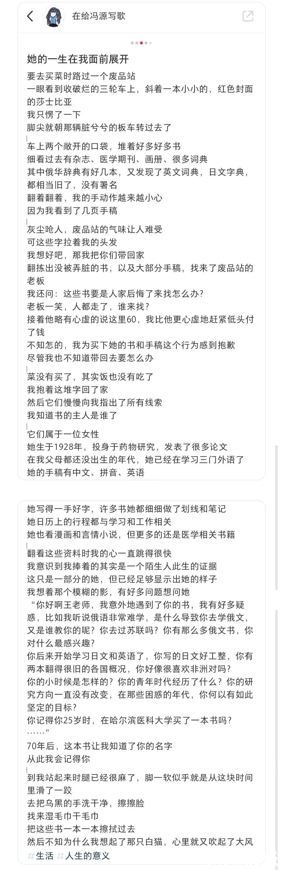 10月21日,冯女士通过网络发文称,她在去买菜的途中路过某废品站,一辆拉了很多旧书的三轮车吸引了她的注意。“有杂志、医学期刊、画册,还有许多俄文词典、英文词典、日文词典,翻阅中我发现竟还夹带了一些手稿。”冯女士向回收站老板购买下了部分旧书和手稿,“翻看这些资料时我的心一直跳得很快,我意识到我捧着的其实是一个陌生人此生的证据,这只是一部分,但已经足够显示出她的样子”