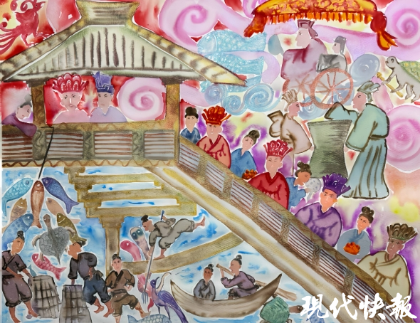 “我从百余幅作品中挑出了呈现中国式浪漫的、比较有故事的《琴瑟和鸣》《燕居图》《水上云台》等。《水上云台》描绘的是人们在水榭休闲的情景,水榭上面有朱雀、祥云,水中有渔船、游鱼等,画面和谐,色彩绚丽。这幅作品被选入卢浮宫官方网站并收录于《卢浮宫画册》,也是我最喜欢的一幅。”顾颖表示。