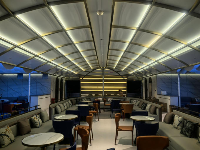 步入“长江之恋”内部,船上充斥着浓浓的长江文化元素——在扶手、卡座、屏幕以及包间命名上,融入了不少关于长江的历史文化典故和长江沿岸的城市地名。作为省内标志性的水上文旅项目,“南京魅力滨江游”不仅是南京对外展示滨江岸线修复、长江大保护成果的生动载体,更是集中展现新时代长江南京段城市历史人文的创新表达。美丽滨江游,四季皆胜景。登上“长江之恋”,目之所及不仅有自然景观,还有文化景观,所见所闻皆是长江生态保护结下的累累硕果与南京丰富的历史文化底蕴。