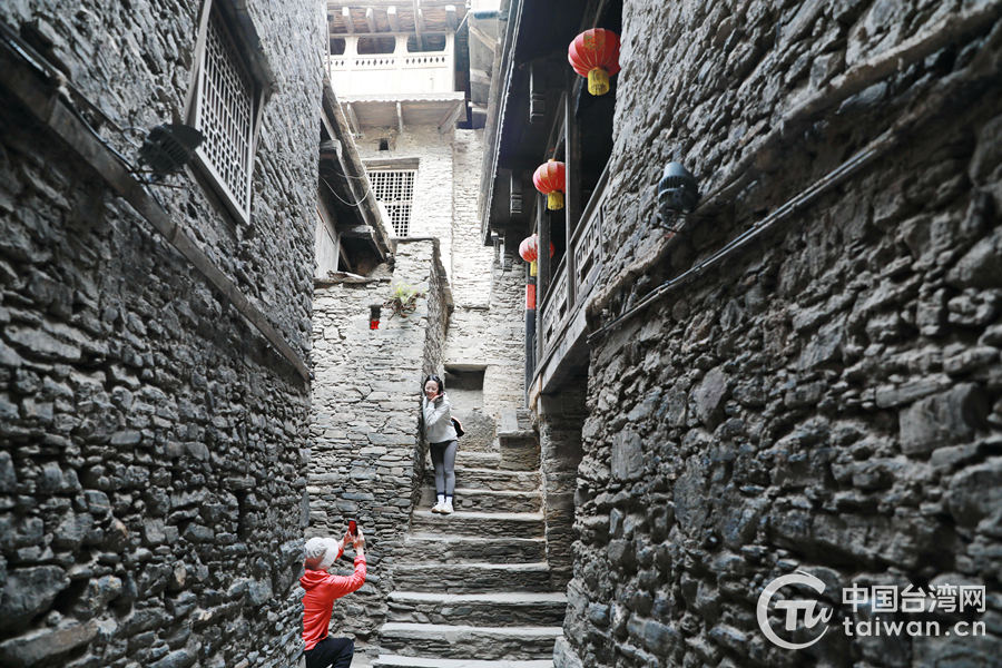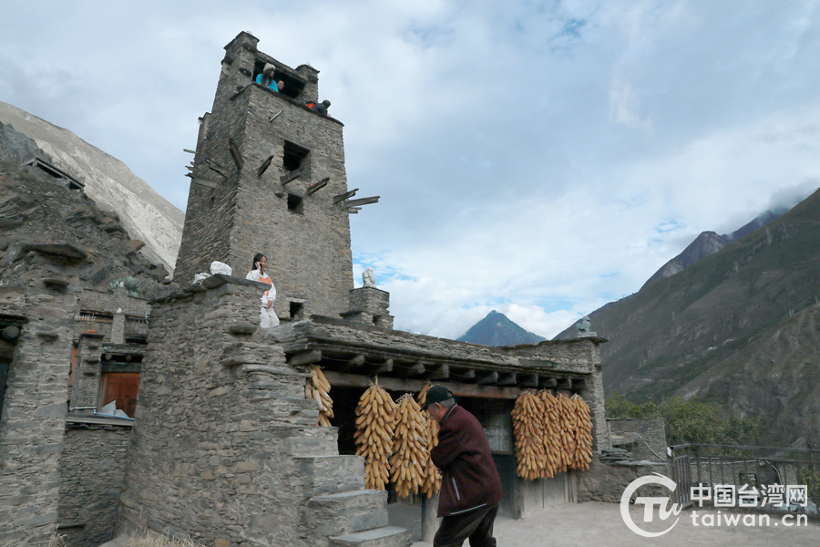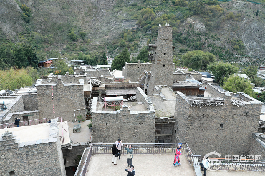 游客在桃坪羌寨拍照留念。(中国台湾网记者李宁摄)