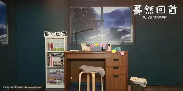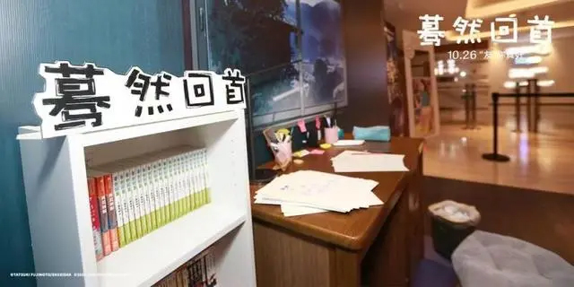 《蓦然回首》中国首映礼上,影厅外场地被布置成电影主题,吸引粉丝观众拿出手机拍照打卡,甚至还为了拍照排起了长队。最受欢迎的是影片海报同款背影照打卡点,现场几乎1:1还原了引进海报的场景,藤野房间的窗户风景、写字桌、堆满漫画的书柜,甚至连垃圾桶都完全复刻了,观众纷纷坐上凳子,摆出藤野的同款动作,拍出属于自己的《蓦然回首》海报同款。此外,主角合影立牌和导演手稿原画展示也吸引了众多粉丝的目光,感受原画师留在画中的鲜活笔触痕迹。
