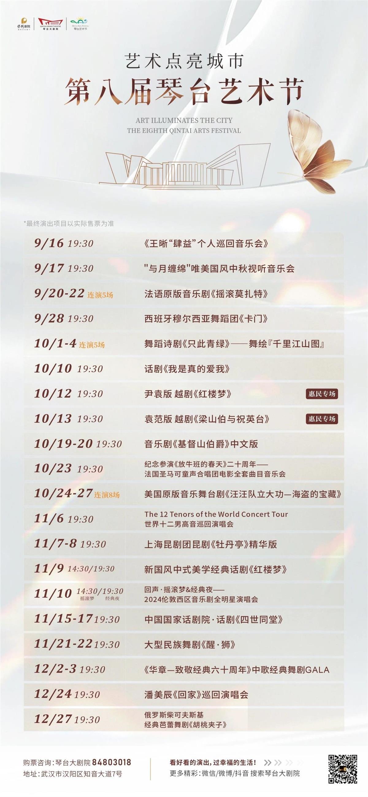 在《胡桃夹子》之外,11月起,包括世界十二男高音巡回演唱会,由上海昆剧团出演,沈昳丽、胡维露主演的昆剧《牡丹亭》精华版,新国风中式美学经典话剧《红楼梦》,号称“一键解锁60+爆款音乐剧曲目”的伦敦西区·音乐剧全明星演唱会,中国国家话剧院话剧,由刘金山、陶虹主演的《四世同堂》,民族舞剧《醒·狮》,潘美辰《回家》演唱会等重磅项目,也将在第八届“琴台艺术节”期间登场。