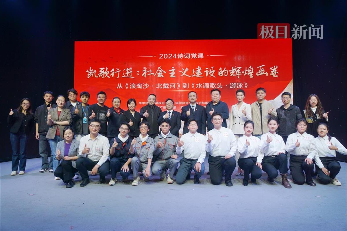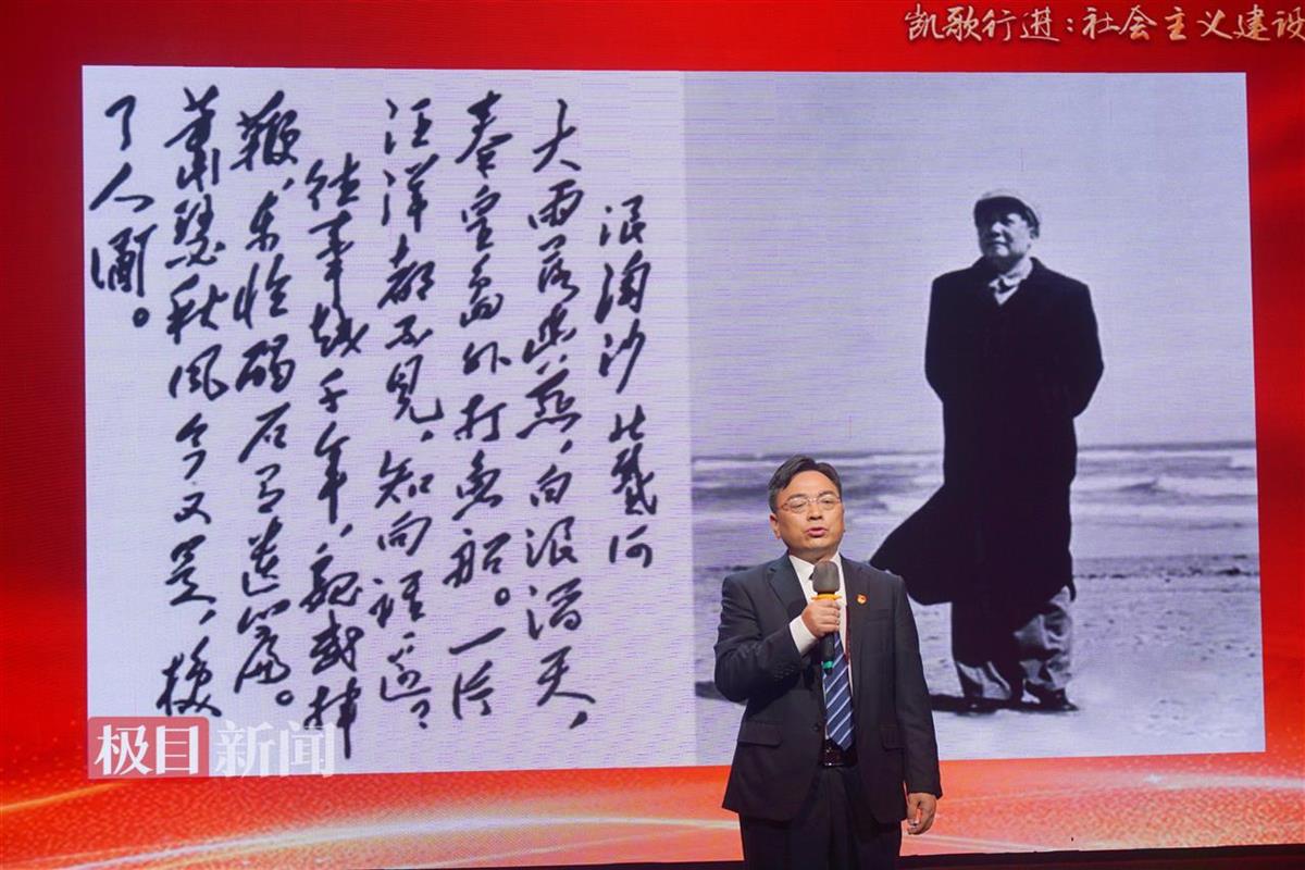 10月30日下午,在清澈嘹亮的歌咏声中,一堂特殊的诗词课《凯歌行进:社会主义建设的辉煌画卷》在华中师范大学开讲。这是继2023年湖北广播电视报和华中师范大学政治与国际关系学院联合推出《永远的焦裕禄精神》诗词党课备受关注后,今年再开新篇,通过毛泽东的经典诗词《浪淘沙·北戴河》与《水调歌头·游泳》,回顾与致敬社会主义建设的伟大成就。