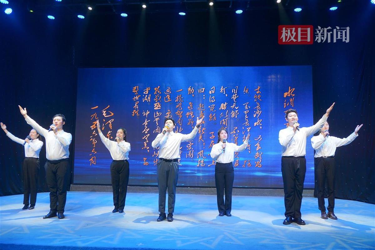 诗词党课现场,青年团员们又通过演唱、朗诵等形式,展现了年轻一代的蓬勃青春与家国情怀。在集体朗诵《水调歌头·游泳》时,屏幕上一幅幅珍贵的历史画面与合唱团热情激昂的歌声交相辉映。现场观看的华中师范大学学生乔宇洋感慨地说,这种诗词与党史“联动”的创新形式,让他深刻体会到祖辈们建立社会主义新中国的艰辛不易,作为新时代年轻人,要谨记“强国有我,不负韶华”。