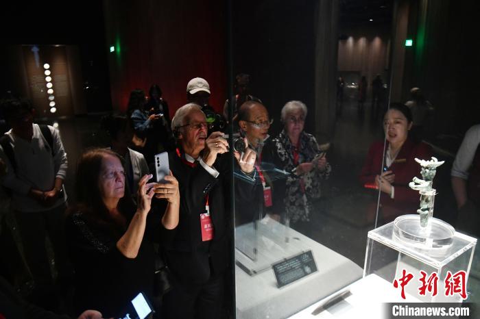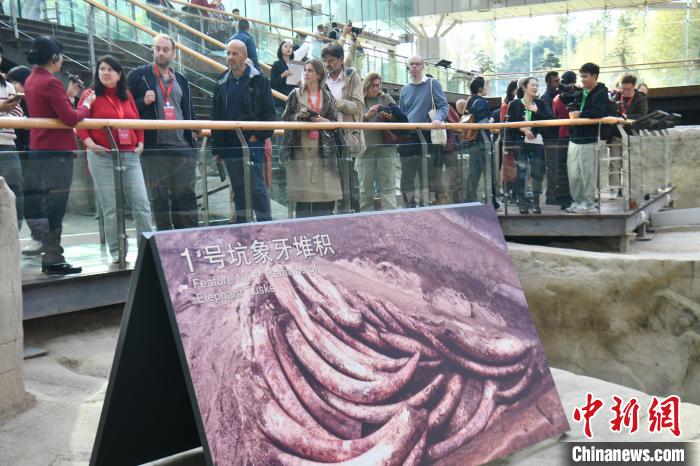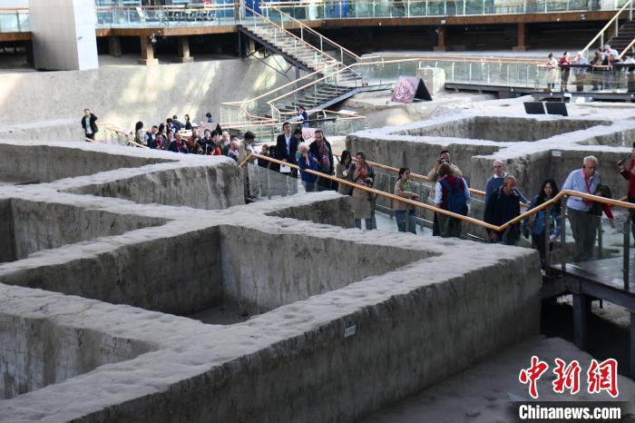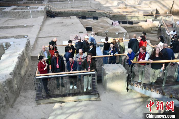 11月4日,首届世界古典学大会“走读中国之四川行”活动在成都举行,来自16个国家的30多位专家学者齐聚四川,感受巴蜀自然、文化。图为代表走进成都金沙遗址博物馆参观遗迹馆。