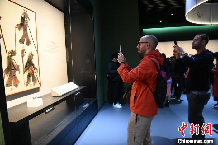 11月4日,首届世界古典学大会“走读中国之四川行”活动在成都举行,来自16个国家的30多位专家学者齐聚四川,感受巴蜀自然、文化。图为代表走进四川博物院参观皮影人物。
