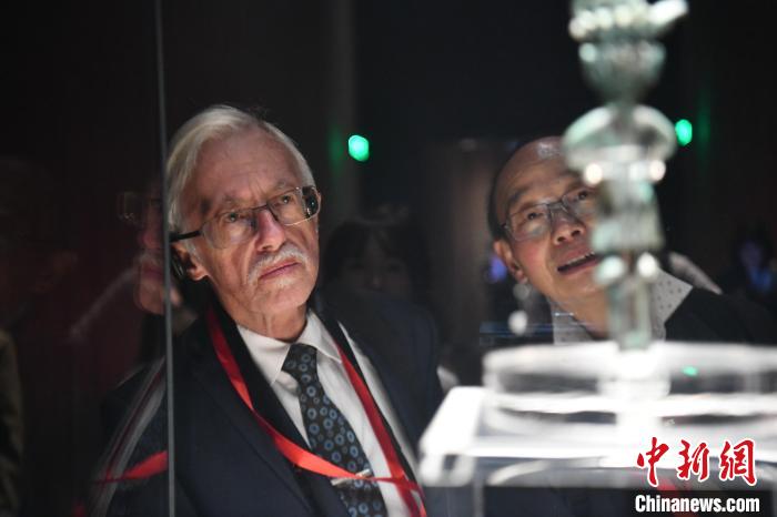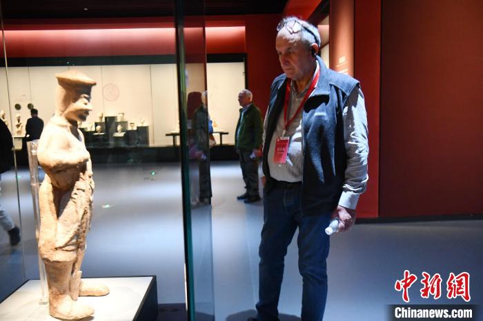 11月4日,首届世界古典学大会“走读中国之四川行”活动在成都举行,来自16个国家的30多位专家学者齐聚四川,感受巴蜀自然、文化。图为代表走进成都金沙遗址博物馆参观“铜立人”。