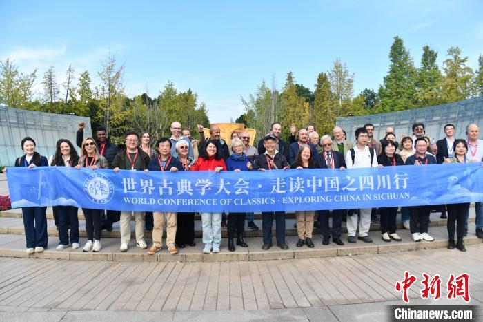 11月4日,首届世界古典学大会“走读中国之四川行”活动在成都举行,来自16个国家的30多位专家学者齐聚四川,感受巴蜀自然、文化。图为代表在成都金沙遗址博物馆合影。