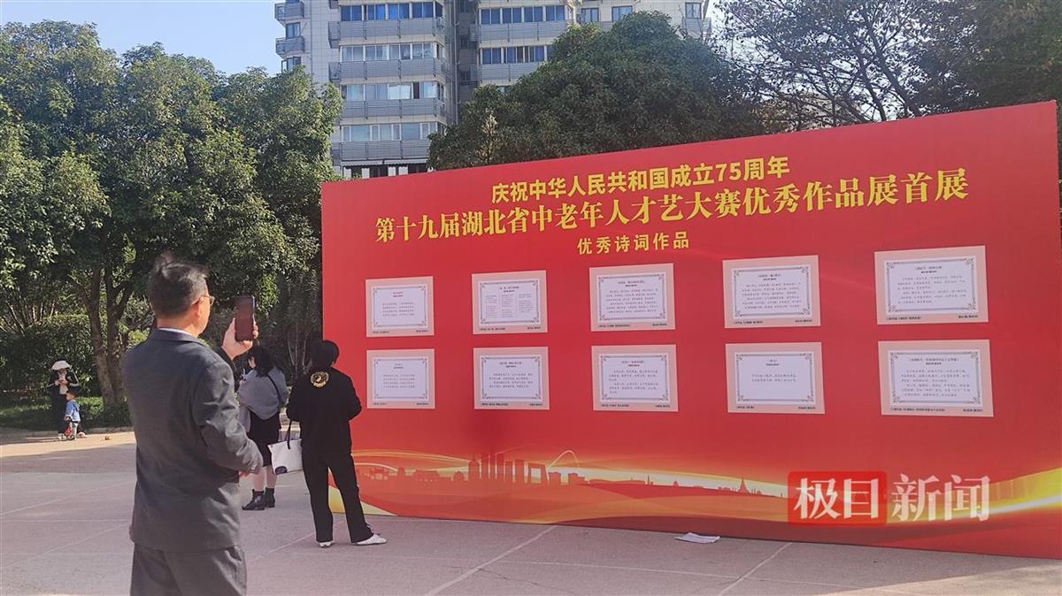 这首作者为郭相奎的《清平乐·农家小院》,获得了“第十九届湖北省中老年人才艺大赛”诗词类一等奖。当日,该才艺大赛优秀作品展首展暨巡展启动,440幅出自全省中老年作者之手的诗词、书法、绘画、摄影作品,在洪山礼堂二楼和洪山礼堂广场展出,吸引很多人在秋日暖阳下驻足欣赏,可谓“翰墨丹青飘清香,诗词光影胜秋光”。