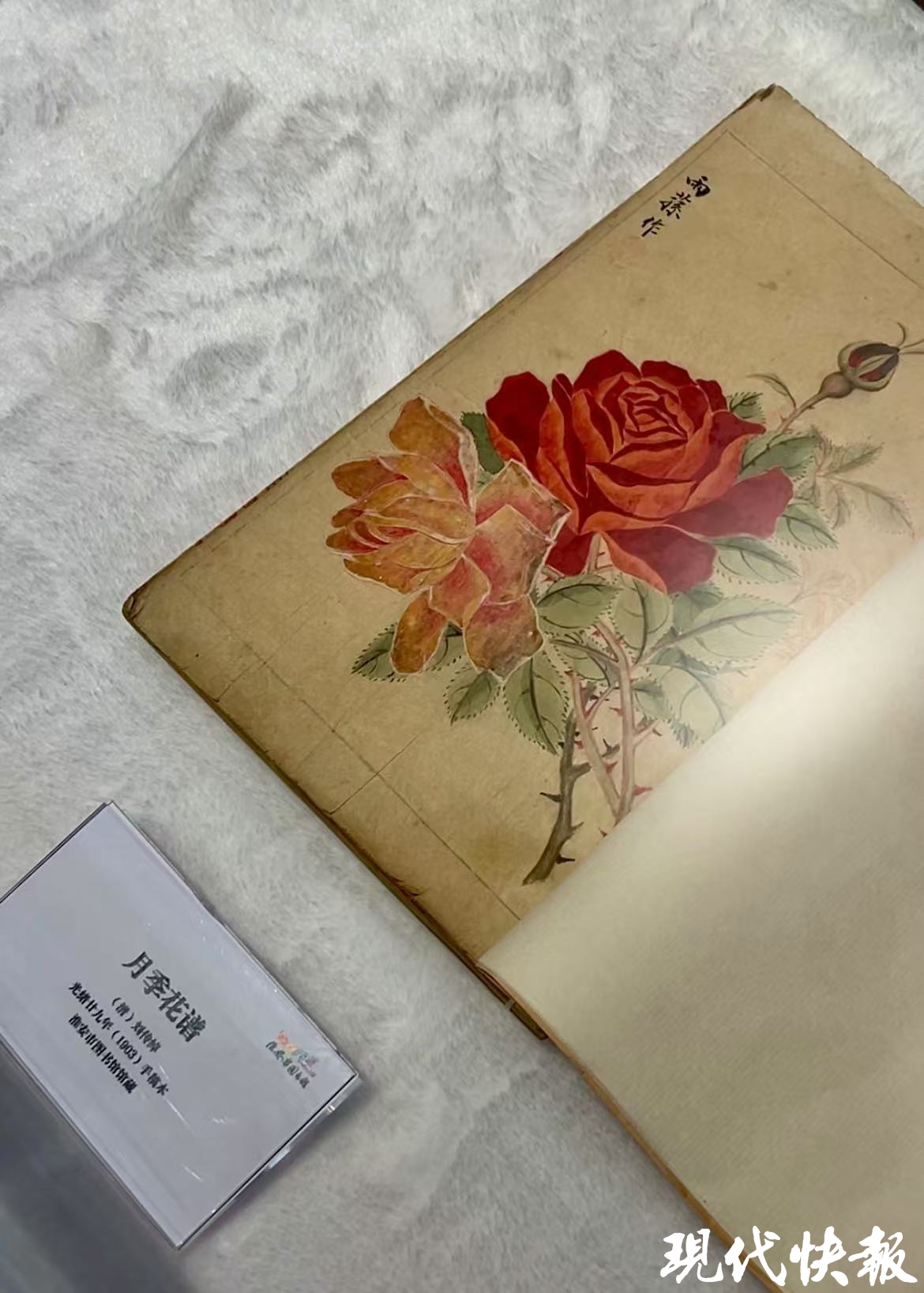 在展厅的手稿展区,一本《月季花谱》吸引了记者的注意,此书扉页绘有两朵栩栩如生的月季花,颜色娇艳,花朵灵动,即使经过了120多年,花朵却依然充满生机。淮安市图书馆读者服务部吉洁介绍,淮安的市花是月季,此书的作者是晚清刘传绰,也是旧时淮阴人,此书是手写稿原稿,封面还有手绘图,字迹清秀俊逸,为月季著作之大成稿本,极具研究价值。
