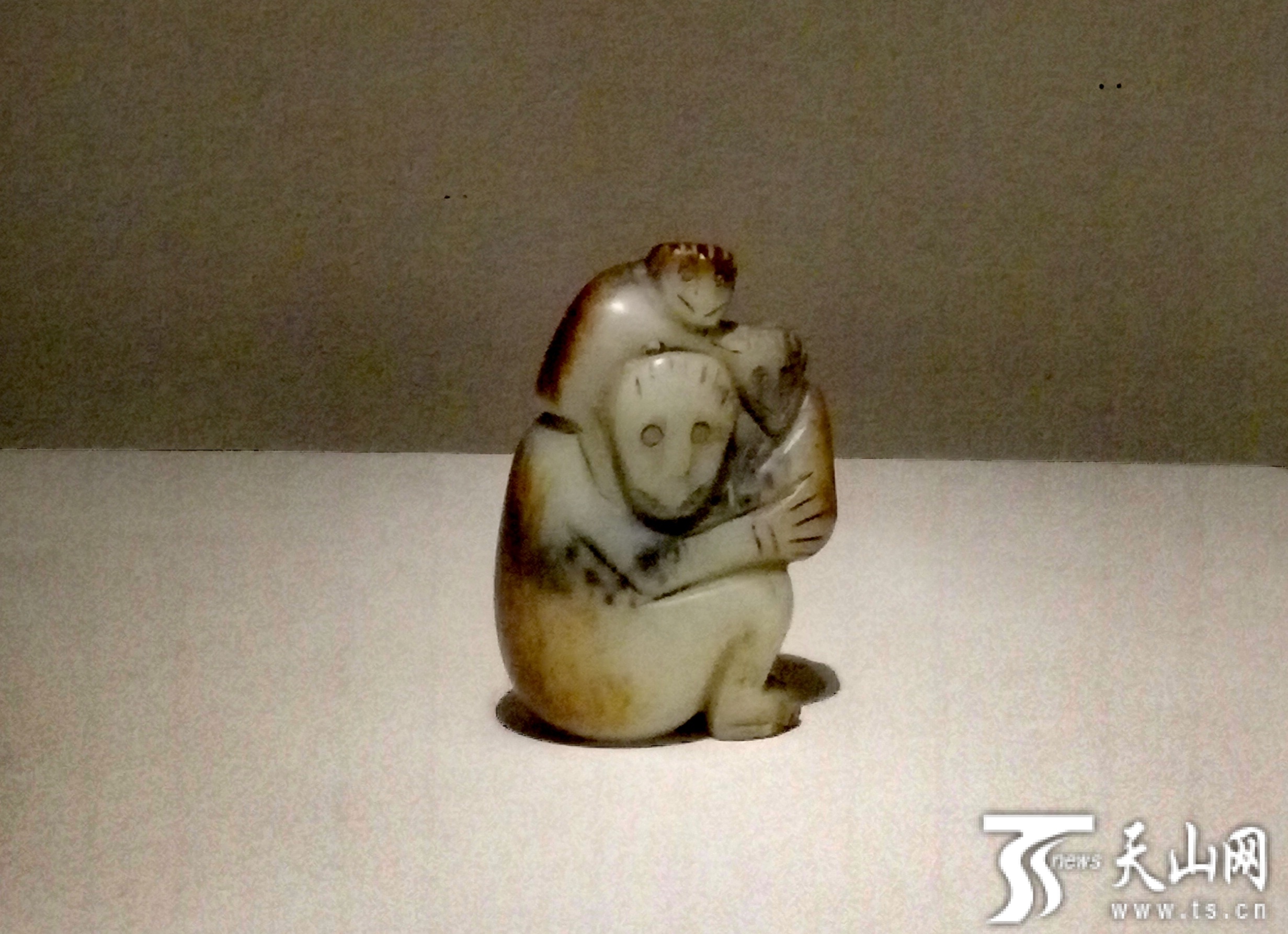 一只蹲坐状的大猴子,怀里抱着一只小猴子,肩部背着一只小猴子,寓意“辈辈封侯”,引得游客争相拍照。在和田地区博物馆“五星出东方利中国——和田历史文化陈列”展厅的这件唐代和田玉猴,是该馆的“镇馆之宝”之一。