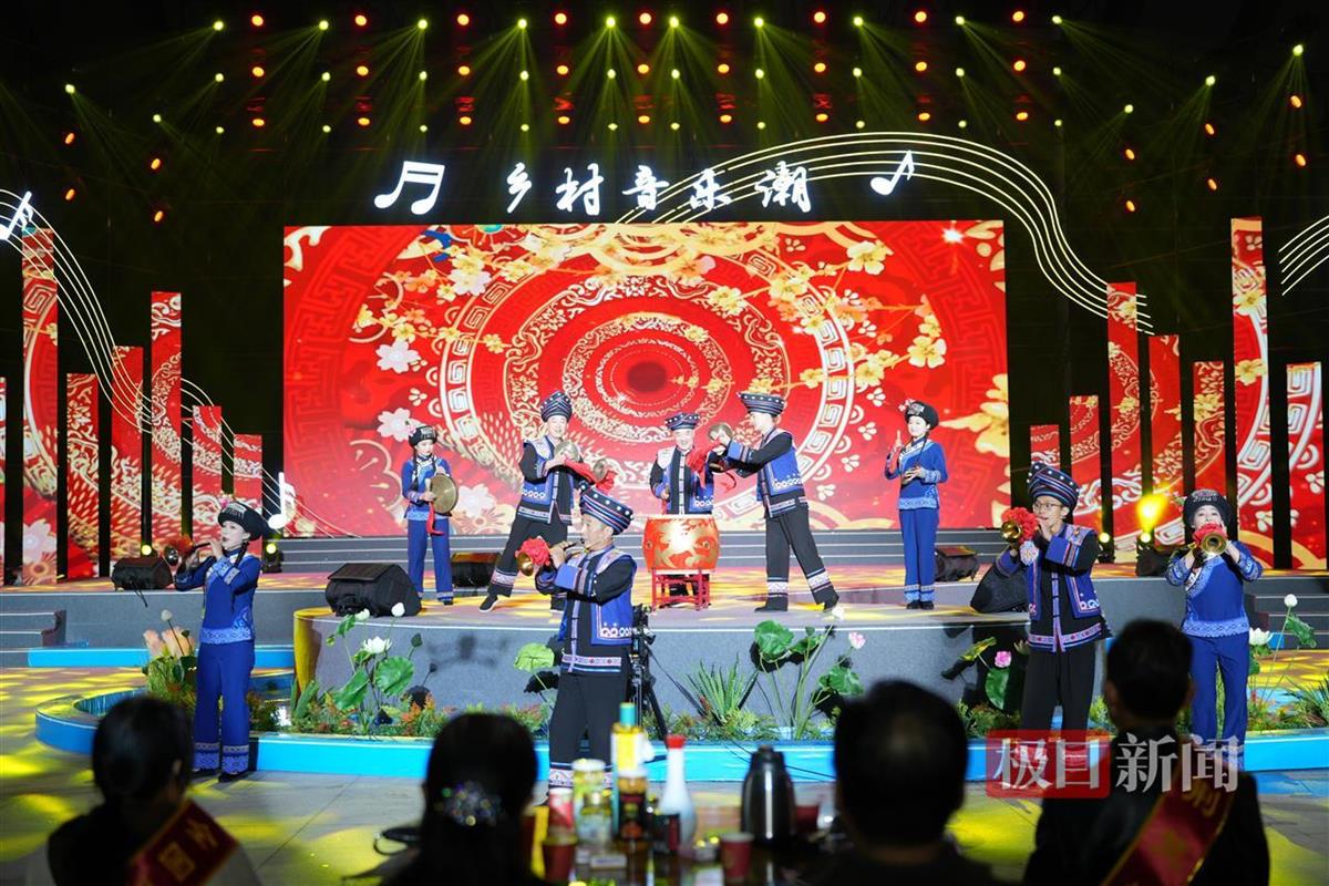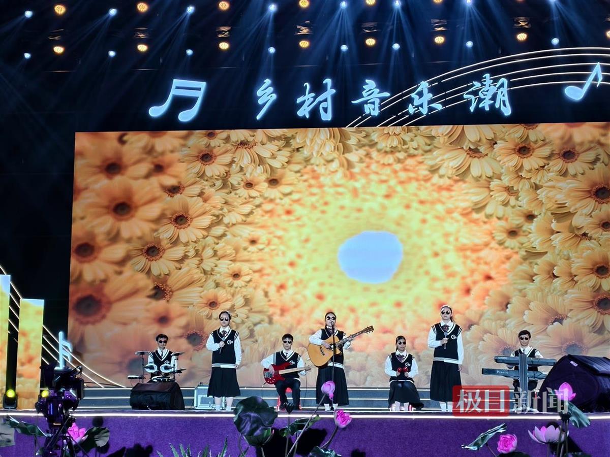来自乡村、讴歌乡村美的音乐潮人,是当晚舞台的主角。紧随“星期七乐队”上台的,是“潮人大赛”银奖、乡音奖、丰收奖的获奖组合。这群鄂西山区土家族的阿哥幺妹们,带来了器乐合奏表演《山寨迎宾》,浓郁的民族风扑面而来,让观众领略到少数民族音乐的魅力。