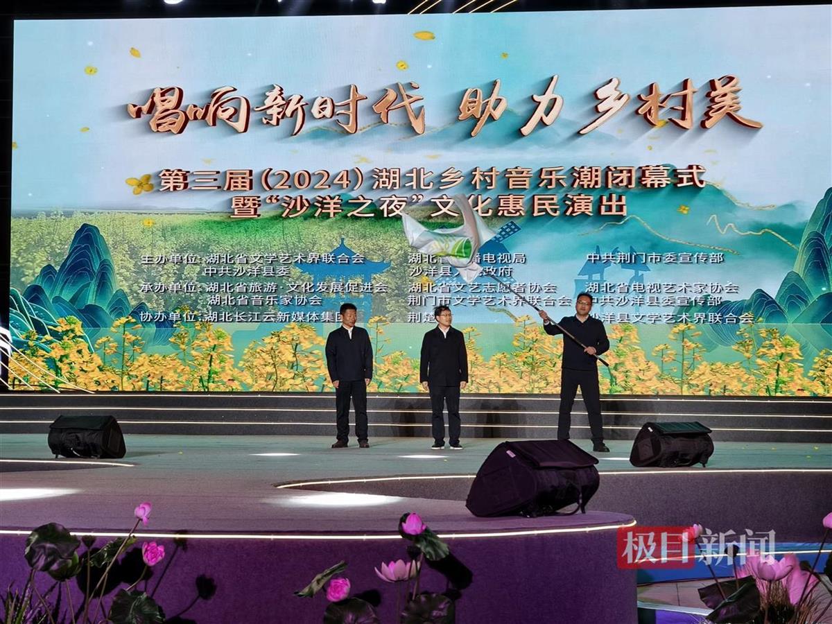 乡村是音乐的摇篮,音乐是乡村的翅膀。本场演出接近尾声时,举行了授旗仪式,湖北省文联、沙洋县和英山县共同完成了“湖北乡村音乐潮”旗帜的交接,标志着这一音乐盛事将在湖北乡村继续传承与发展。
