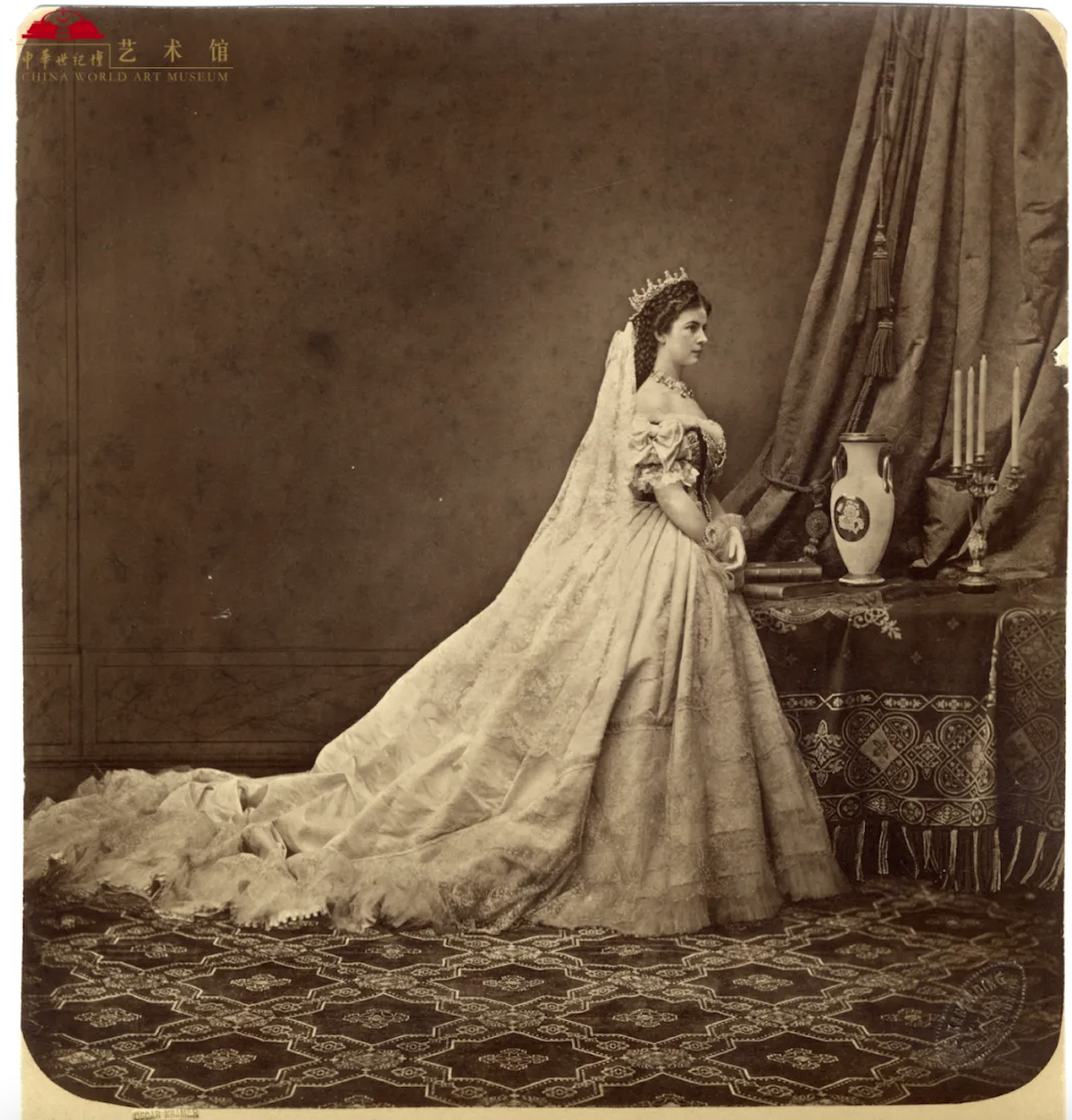 此次展览将带来多幅茜茜的油画肖像、历史照片和雕塑。包括1866年拍摄的《身着匈牙利礼服的伊丽莎白王后》照片,展示了欧洲宫廷的奢华风貌。茜茜穿着层层叠叠的华丽纱裙,头戴王冠,配饰工艺精美,展现了那个时代的审美巅峰。