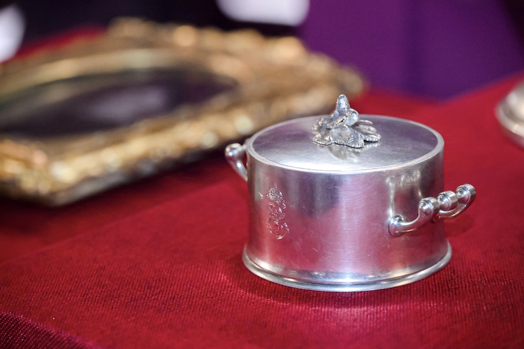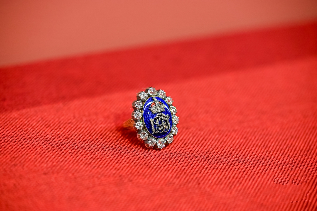 一件展品为金质蓝色珐琅烟盒,镶嵌钻石和红宝石,饰有“I.FJ”首字母和匈牙利王冠。遵循古老的王室传统,皇帝常以赠送纪念品的方式来表彰功绩或表示恩宠。这样精美的烟盒由皇家宫廷珠宝商设计制作,体现了王室的奢华与庄严。