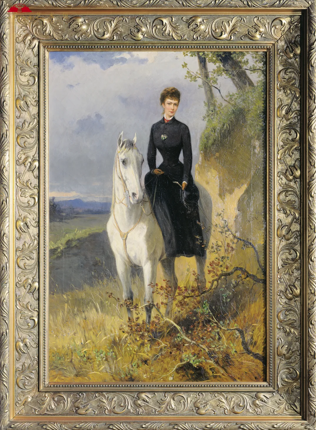 在这次展览中展出了著名艺术家威廉·里希特1877年创作的油画《马背上的伊丽莎白王后》。画中,茜茜公主身着黑色骑装,骑在一匹白马上,身形挺拔,身后是旷野与蓝天,这正是她所钟情的驰骋人生。