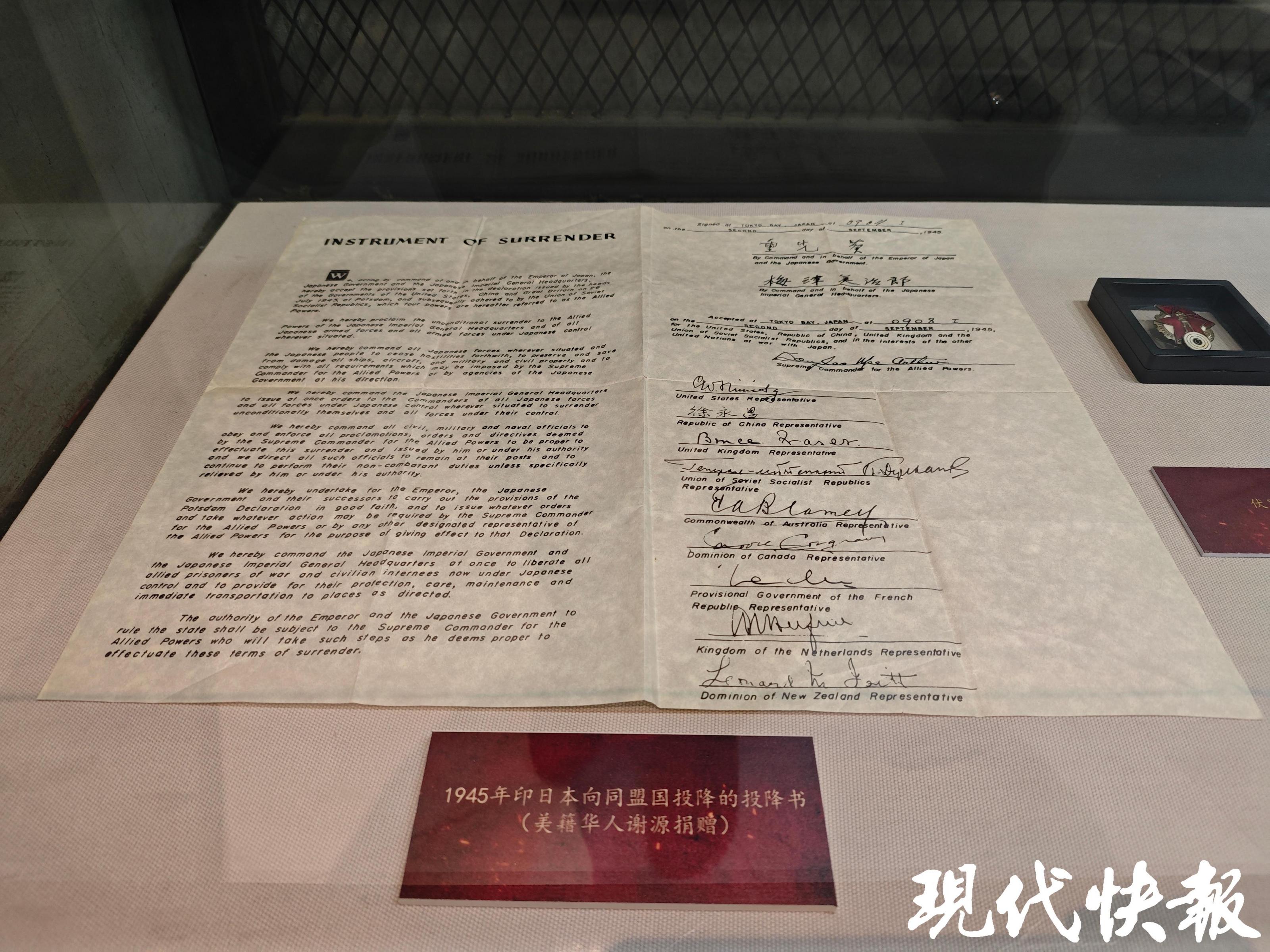 另一件首次展出的是日本向同盟国家投降的降书印刷品。此件为南京抗日航空烈士纪念馆今年文史资料征集成果之一。1945年9月2日,日本代表在东京湾“密苏里”号军舰上向同盟国家签署投降书,宣告了世界反法西斯战争的完全胜利。降书左侧为日本投降后须履行的各项条款,右侧为签署时间、日方及多个同盟国家代表签字。