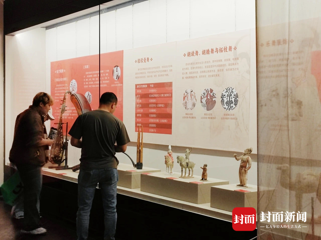 从“绣罗衣裳照暮春”,到“弦鼓一声双袖举”,到“文章分得凤凰毛”,再到“食得人间烟火味”,展览的四个单元用诗句为名,以初唐女性的生活为主题,讲述了她们的衣着服饰、音乐舞蹈、文学才华、休闲娱乐及生活方式等方面。在展览呈现的图片文字中,还能看到唐代女性面部的妆容过程,了解初唐女性的日常穿着,感受她们随着追求着装大胆开放、标新立异,开始喜穿胡服与男装……