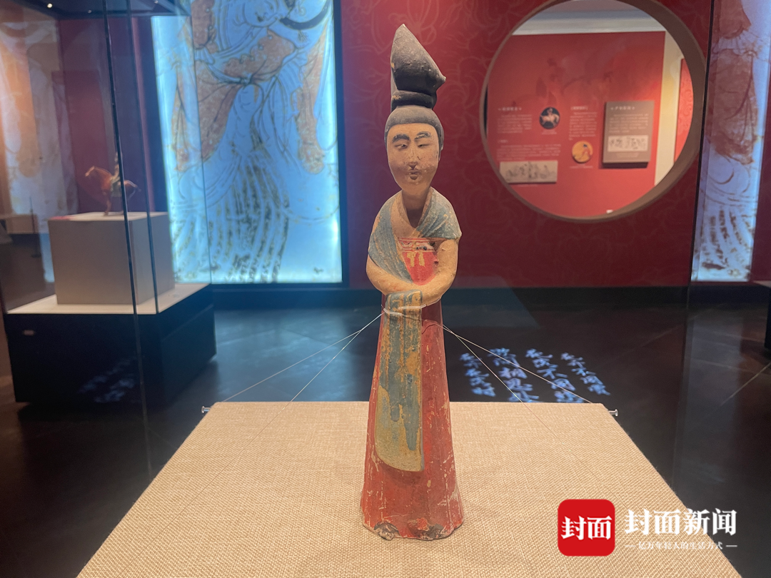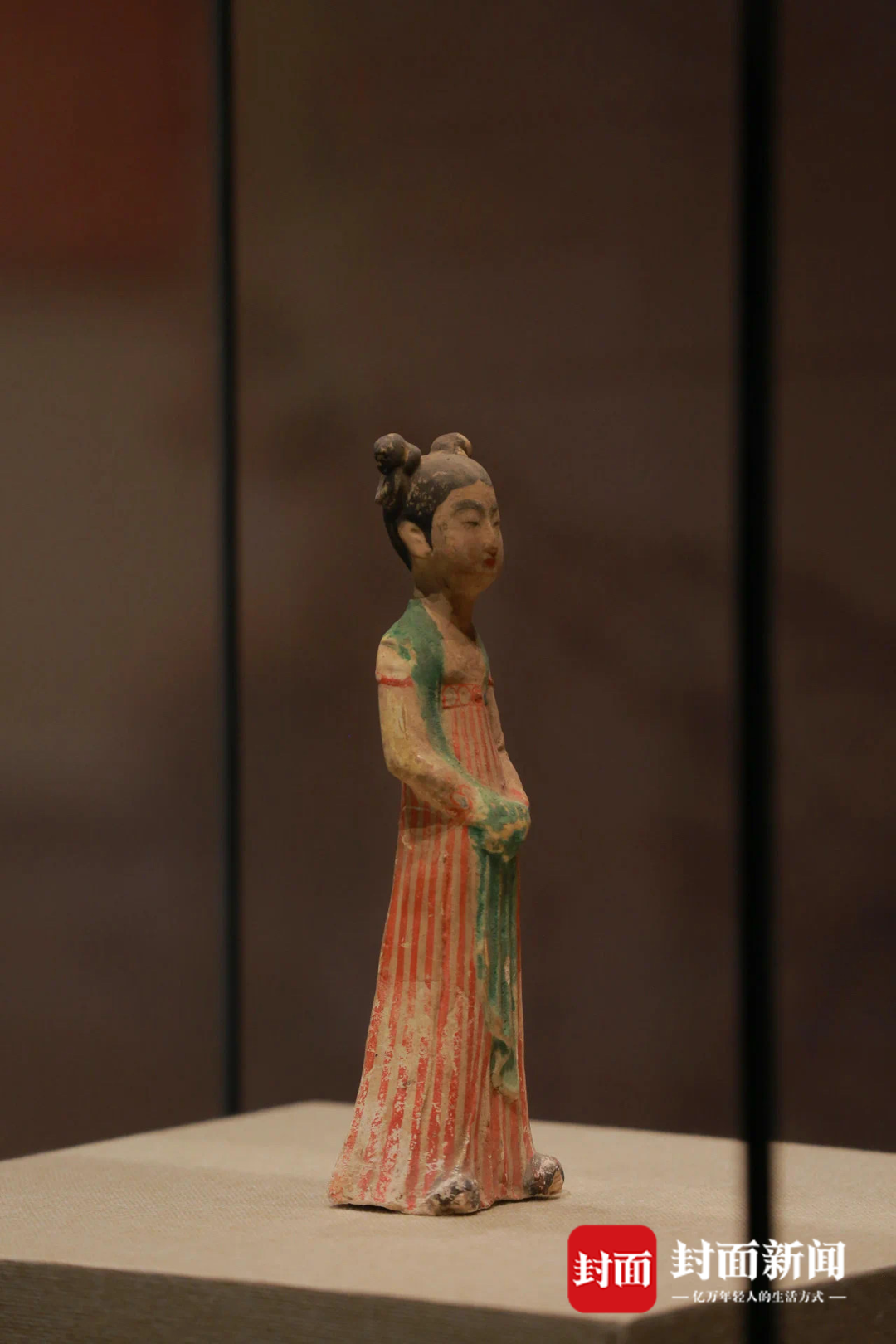 采访中,刘婷特别介绍到了一件彩绘釉陶女袖手立俑,这是来自昭陵博物馆的一级文物,其俑头梳单刀髻,系红长裙,披蓝帔巾,袒胸,双手曲于胸前,面部表情生动通真,栩栩如生。“这件俑体态匀称、亭亭而立,展现了初唐女性自信、开放的精神风貌。”