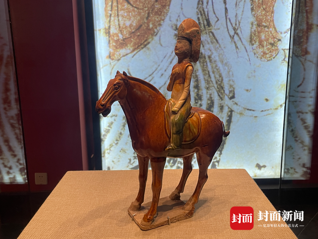 同时,刘婷还介绍到了一件李贞墓中出土的三彩女骑马俑,也是此次展览中她个人最喜欢的一件展品。“这件俑非常漂亮,着胡服、戴胡帽,端庄俊秀,其于温婉秀美中平添了几分男子的潇洒与英气。面带微笑的表情,更加衬托出一位‘富家小姐’自信开放、乐观向上的动人形象,体现了强烈的艺术感和时代感。这件陶俑是文物中的佼佼者,昭陵仅此一件,尤为珍贵。”