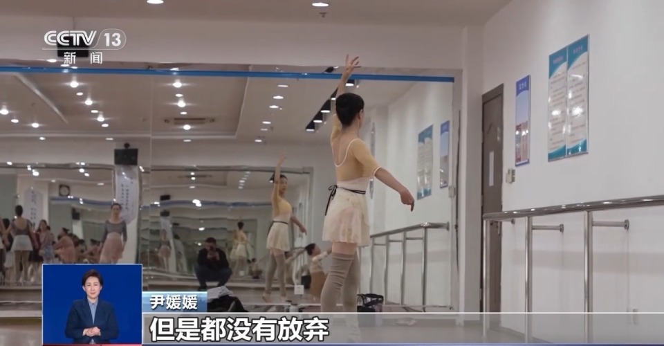 尹媛媛:我现在基本上能一直穿着足尖鞋跟下来一节课,能穿下来就是进步。大家都在坚持,其实每一个人都很疼,但是都没有放弃。