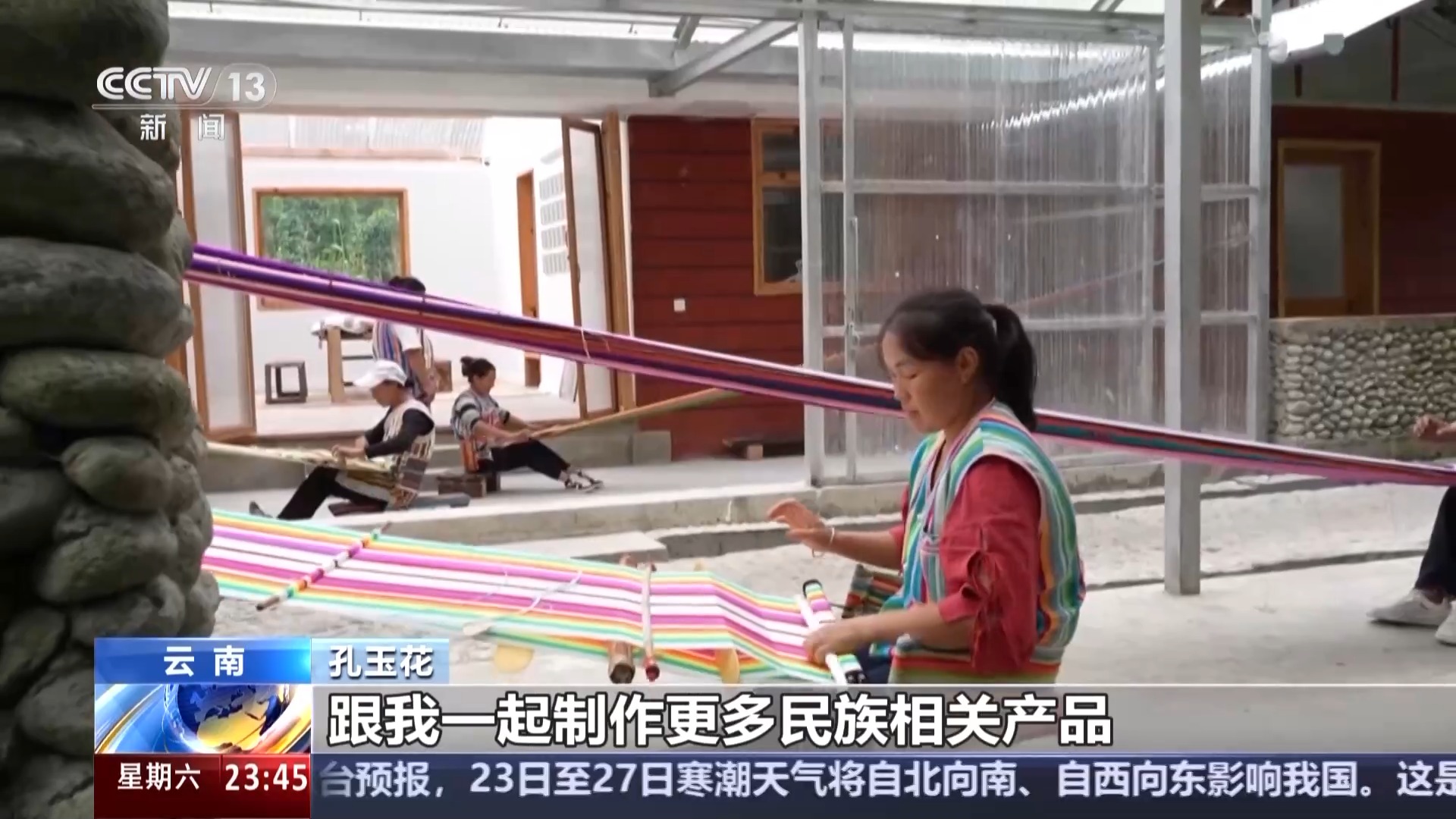 坐在腰机旁,上下开启织口、左右穿引纬纱,将彩色丝麻线织成独龙毯,昼可为衣、夜可做被。宽窄相间的条纹,红、蓝、绿交织的撞色搭配,独特的设计像一道“流动的彩虹”在布面上铺展开来。孔玉花说,自己的心愿就是让独龙毯走进大家的日常生活,让更多人能感受这一非遗技艺的独特魅力,她会为了实现这个目标不断努力。