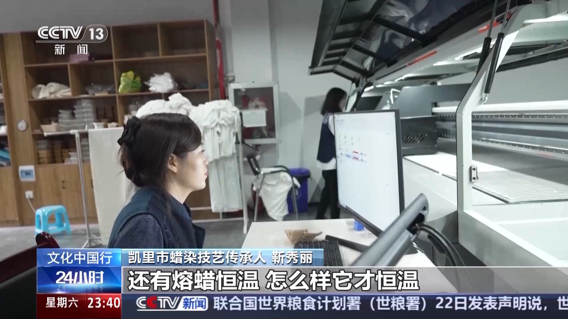 凯里市蜡染技艺传承人 靳秀丽:我们大概花了4年的时间,就不停地去试验,包括喷印的技术,用什么样的喷头它才合适,还有熔蜡恒温怎么样它才恒温。在反复地做这样的实验,设备出来以后也给我很大的惊喜。