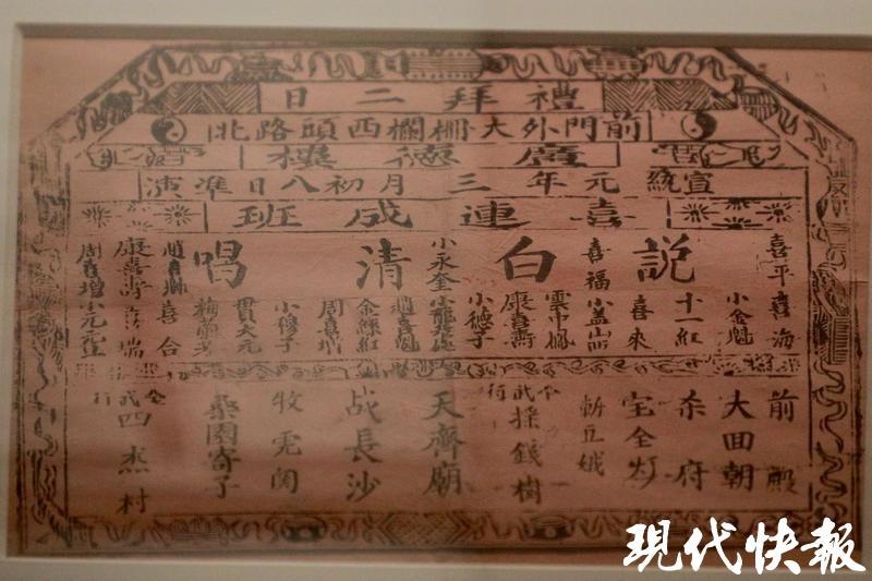 展厅内展出了梅兰芳各个时期的演出戏单。其中一张宣统元年(1909年)的《广德楼三月初八戏单》,为目前存世最早的梅兰芳演出戏单,彼时梅兰芳搭班“喜连成”演出,不满15岁。