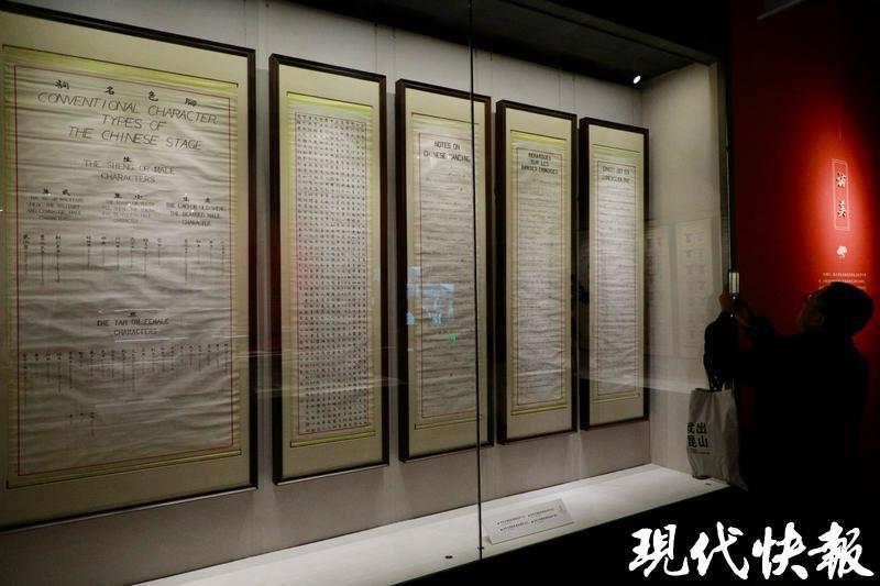 展厅中,梅兰芳当年为访美而制作的京剧图谱惊艳亮相。“生”的英文是TheShengorMaleCharacters,“旦”的英文是TheTanorFemaleCharacters……这份京剧图谱中英文对照,纯手写、手绘,特别精美。