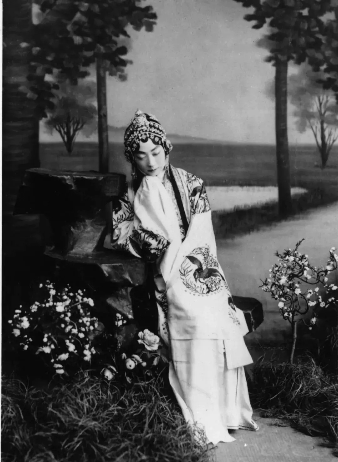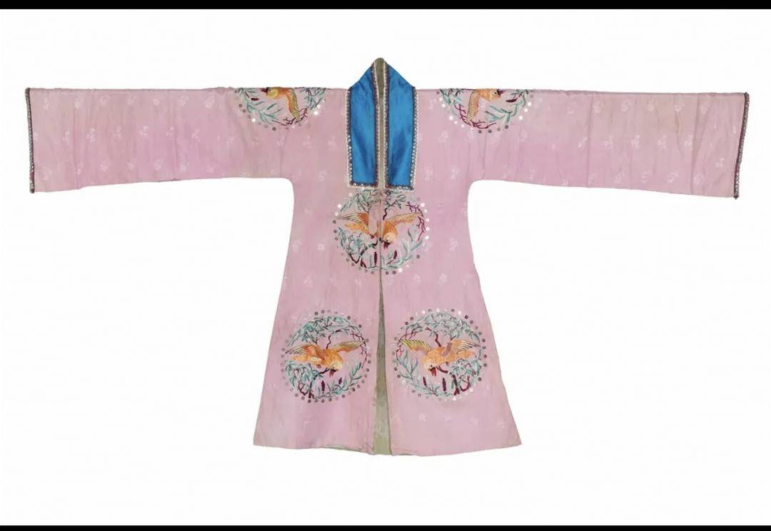 展览中展出的一件20世纪20至30年代梅兰芳穿过的戏服,是他在表演昆曲《游园惊梦》时所穿,通身绣十团花鸟纹图案,用渐变的彩线绣出天竺和飞鸟的形象,寓意“春意盎然”“天长地久”。《游园惊梦》堪称梅兰芳的招牌戏、代表作,演出跨度持续近半个世纪,一直持续到梅兰芳晚年。1960年,梅兰芳出演的《游园惊梦》彩色电影片上映。他将昆曲中的身段、曲调等引入到京剧当中,又在创作新戏时不断探求新的表现形式,强化个人表演风格,细致塑造人物形象,由此形成独树一帜的梅派艺术。