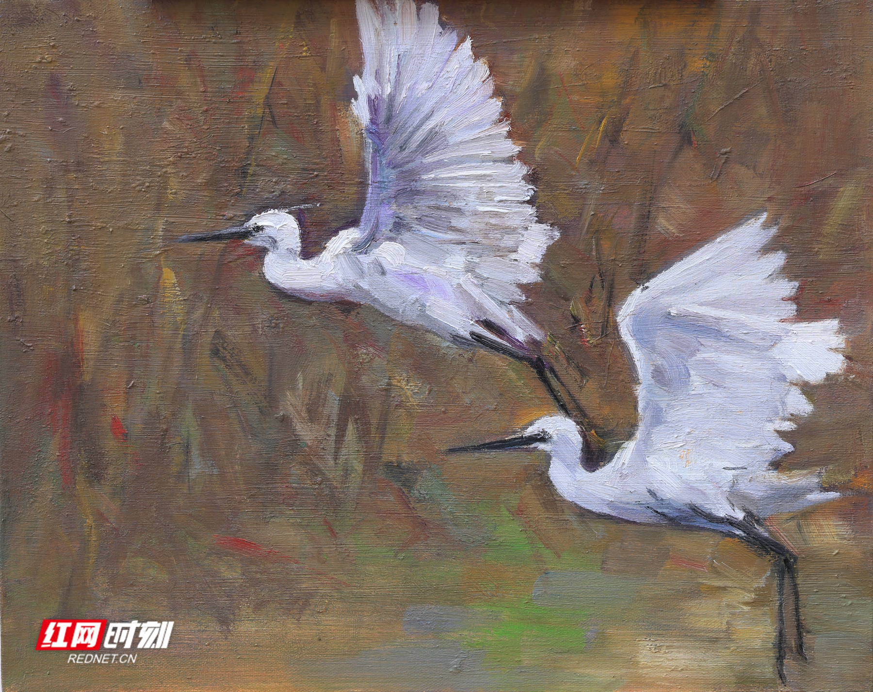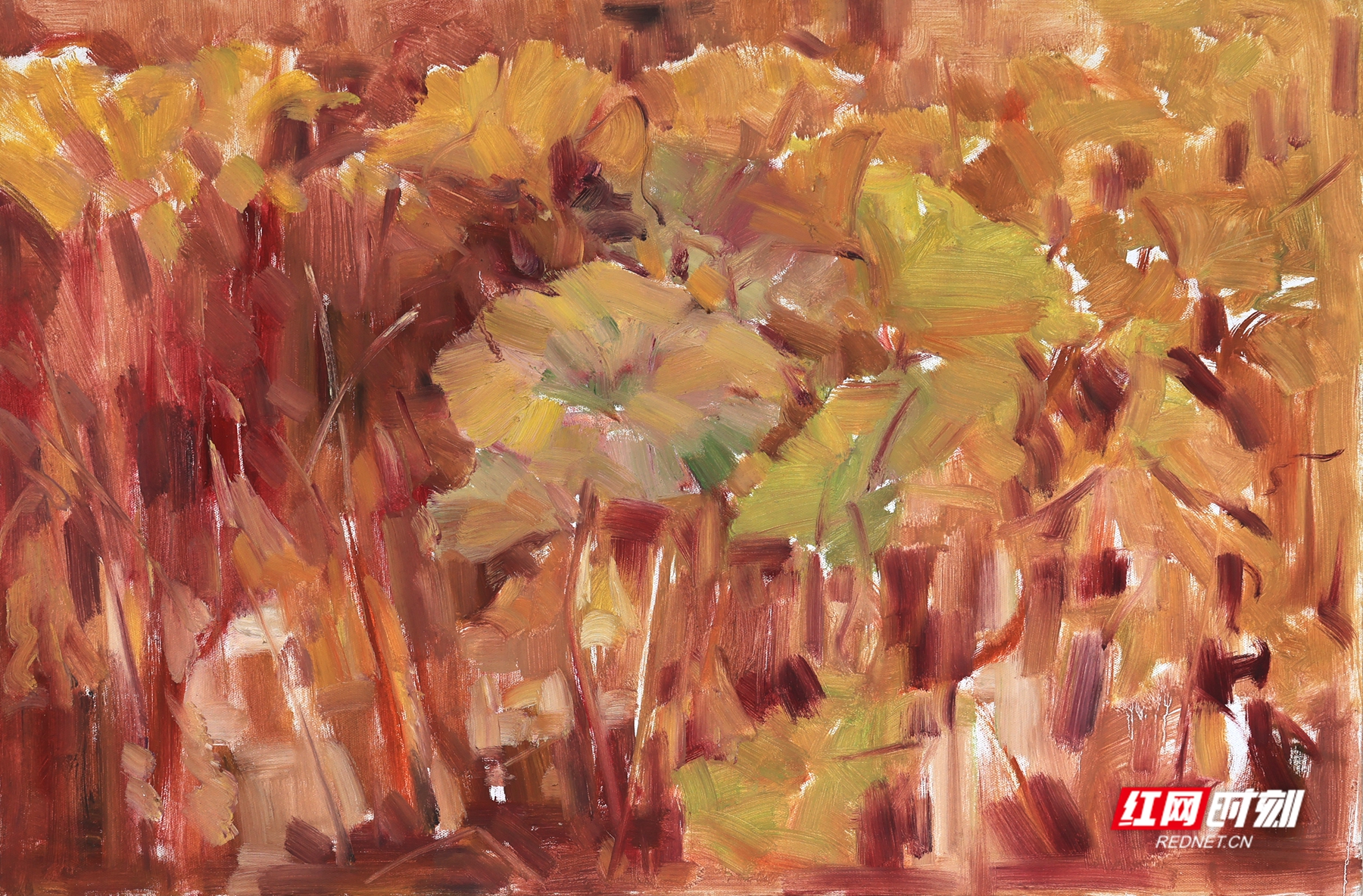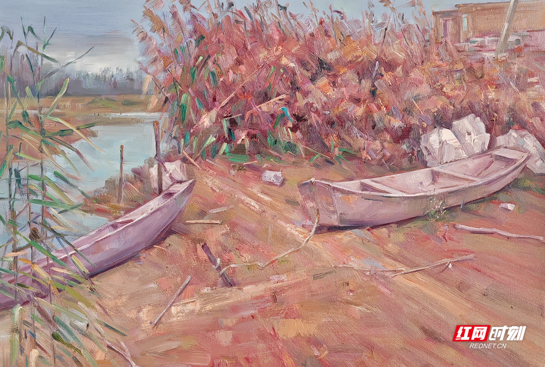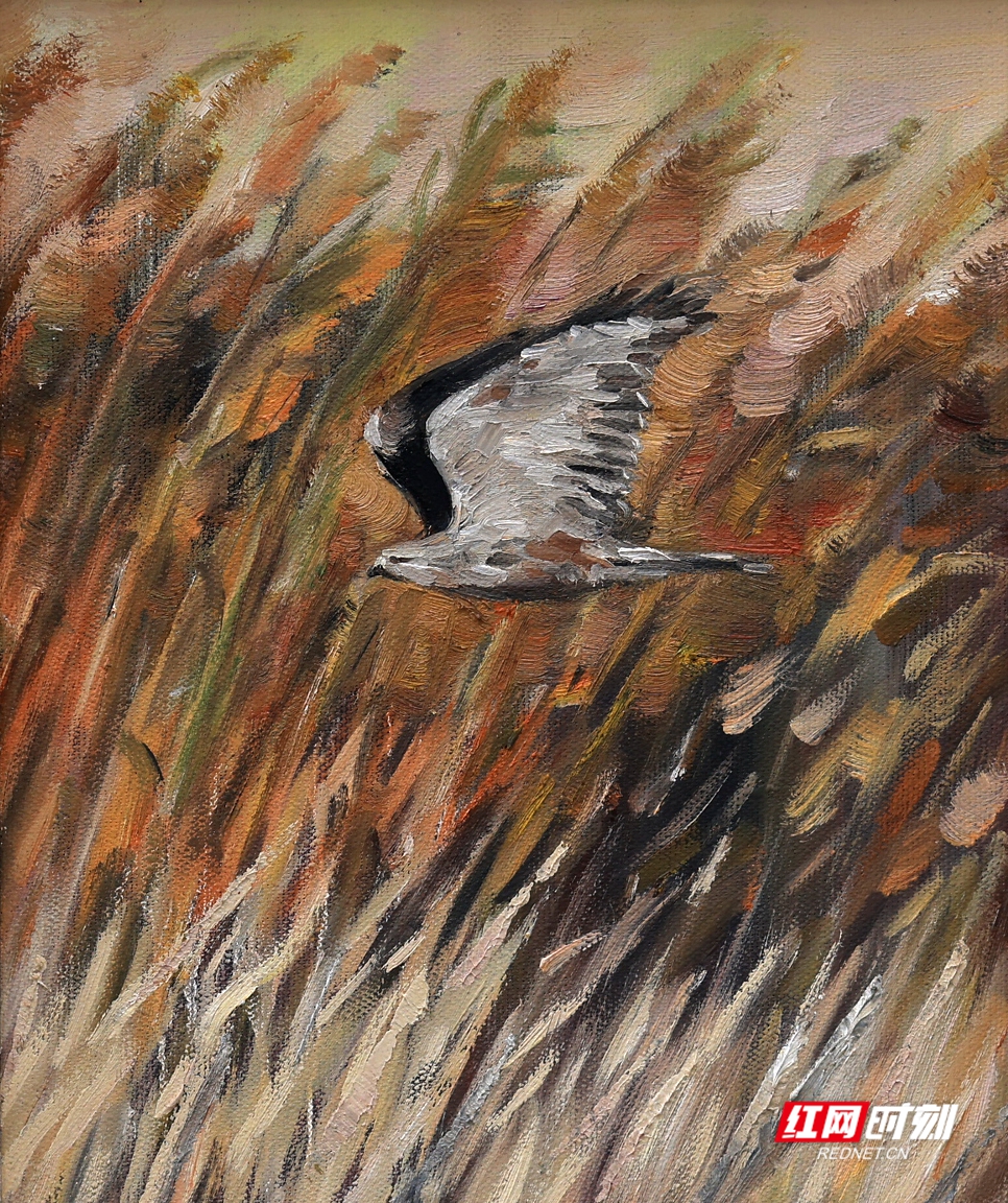 在聂浩元的这些油画作品中,湖边的芦苇在秋风中轻轻摇摆,洁白的芦花随风飞舞,类似飘落的雪花。在这片安静的树林中,成群的白鹭时而盘旋在空中,时而掠过水面。船在湖中缓缓前行,湖水清澈见底,水草在水中随波摇曳,时而有鱼儿跃出水面,打破水面的平静,荡开几圈涟漪。还有金黄的稻谷,零落的残荷……