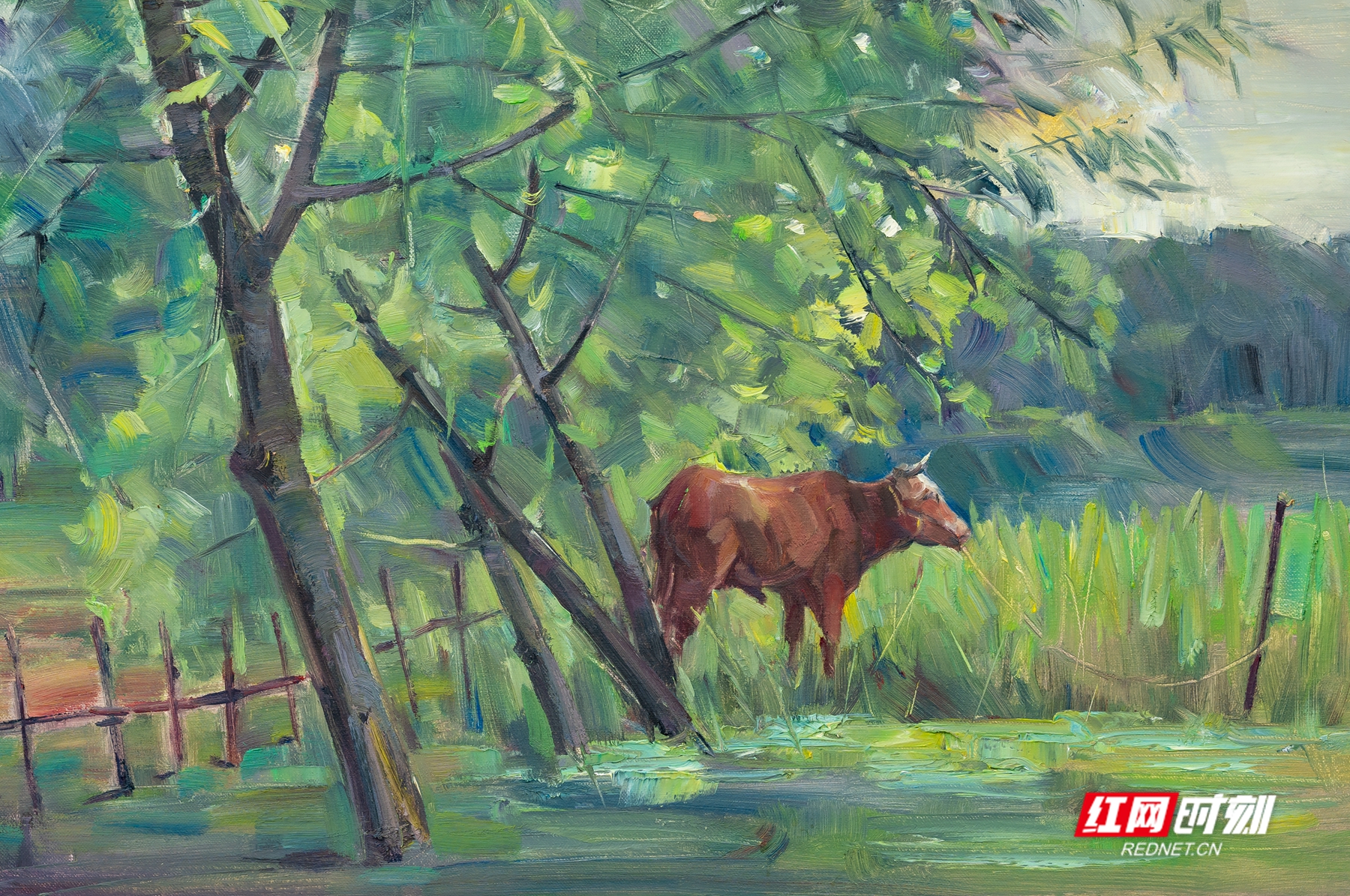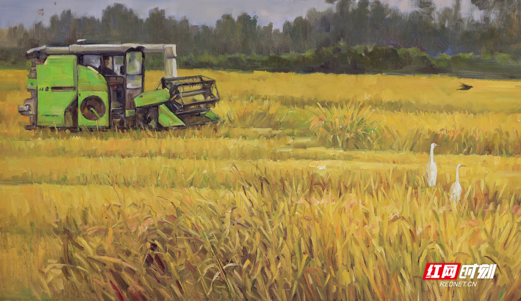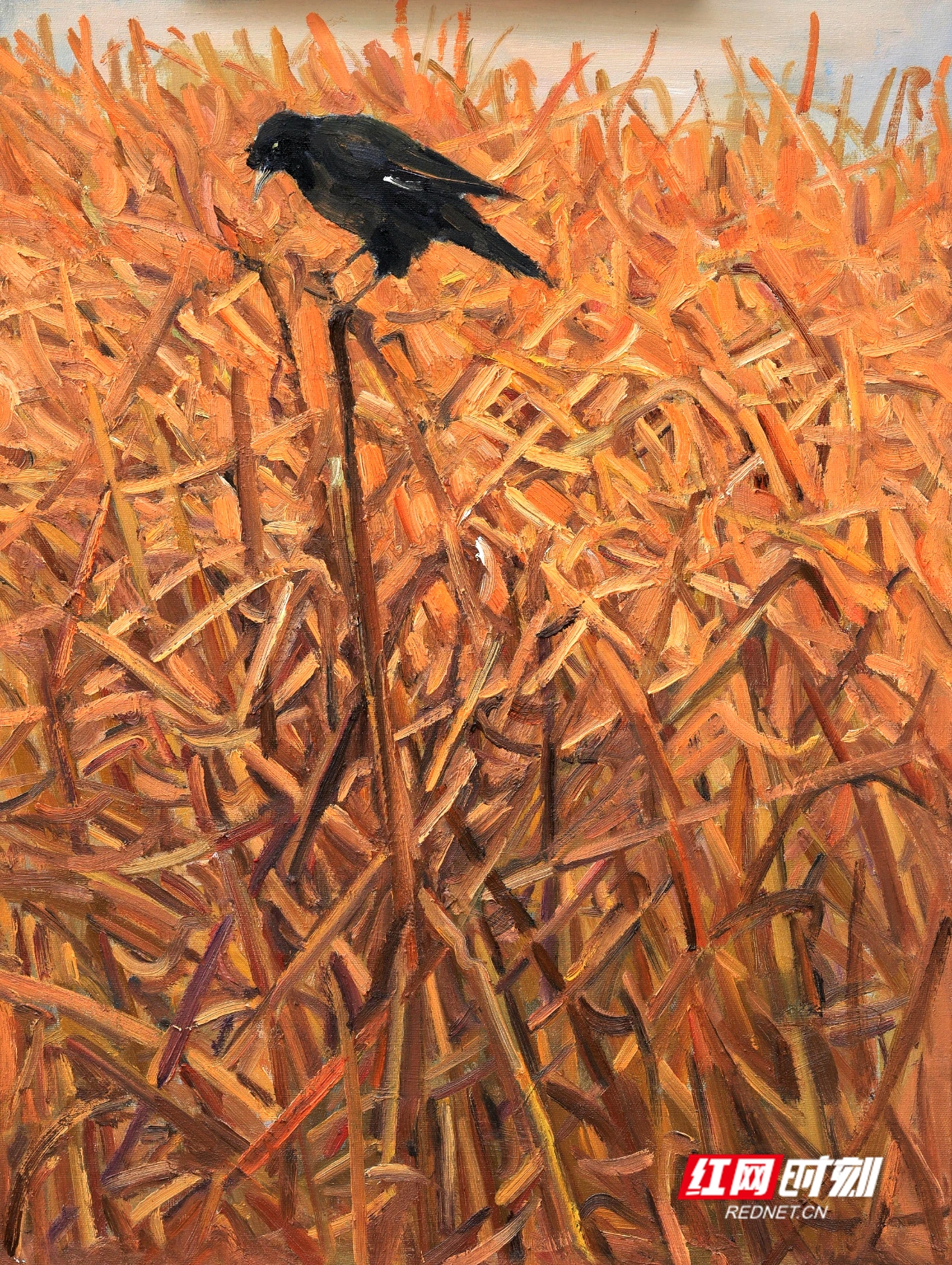 在聂浩元的这些油画作品中,湖边的芦苇在秋风中轻轻摇摆,洁白的芦花随风飞舞,类似飘落的雪花。在这片安静的树林中,成群的白鹭时而盘旋在空中,时而掠过水面。船在湖中缓缓前行,湖水清澈见底,水草在水中随波摇曳,时而有鱼儿跃出水面,打破水面的平静,荡开几圈涟漪。还有金黄的稻谷,零落的残荷……