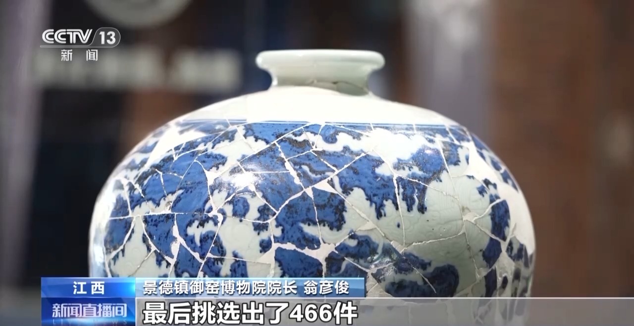 景德镇御窑博物院院长翁彦俊:明代永乐年间的蓝底白花龙凤纹的梅瓶,是从上万件的碎片中,最后挑选出了466件,拼对出了这样一个整体。