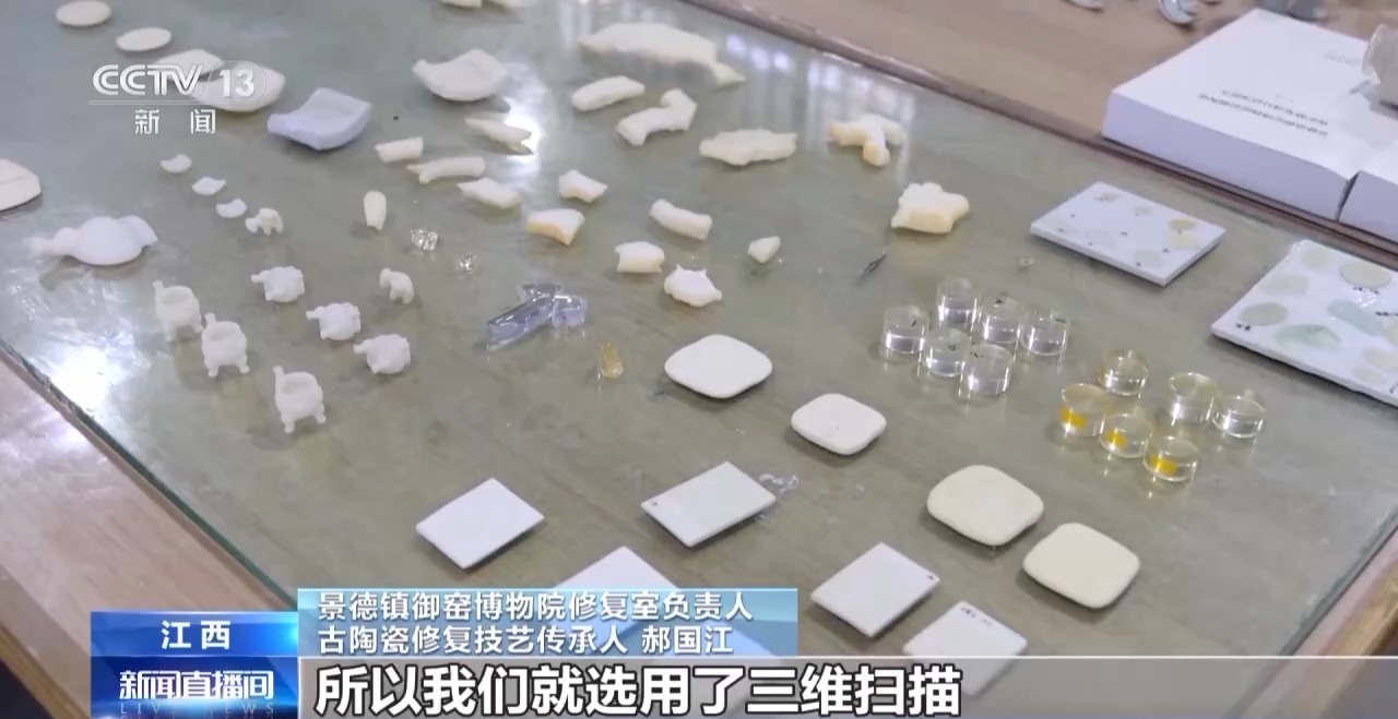 景德镇御窑博物院修复室负责人古陶瓷修复技艺传承人郝国江:我们希望通过这种镂空和补配的假体,帮助专家学者更方便看到器物内壁的施釉的痕迹。我们选用了三维扫描、3D打印的技术,将这种光敏树脂打印出来,将补配件镶嵌进去。