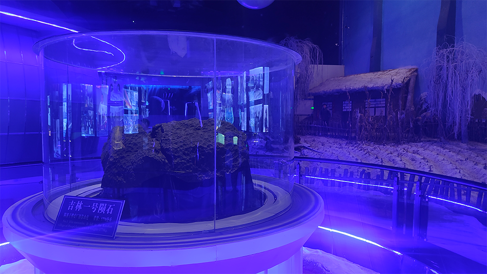 “吉林一号”陨石重达1770千克。在展厅内如上图所示,“吉林一号”陨石布展位置与远处茅屋的距离,也是当时“吉林一号”陨石坠落处与茅屋的实际距离。这场陨石雨陨落面积达500平方千米,却未伤及一人、一畜、一物,这颗最大的陨石也因此被称为幸运石。