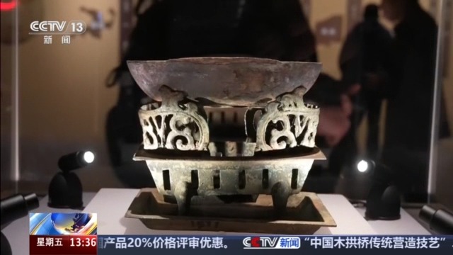 总台记者 易文韬:现在展柜里陈列的这件青铜器名为“青铜温鼎”,它的历史距今已经有两千一百多年了,上面像一口圆形的锅,下面有一个铜盘,在出土时锅内发现了板栗的残留物,下方的铜盘则有炭烤的痕迹。