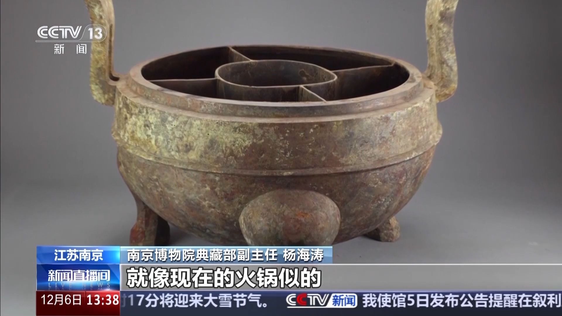 南京博物院典藏部副主任 杨海涛:我们推测它可能是两个作用,一个作用就是不同的食物放到里面进行烹调,就像现在的火锅似的,鸳鸯锅之类的。另外一种汉代它比较讲究五行,那么这养生跟食疗可能有关,就是不同的食物放到里面炖,可能会产生这种养生的效果。中国的传统,饮食不仅是一个对食物的填饱肚子的需求,有中医养生的需求,在不同的节气进食不同的食品,大雪时节像火锅这种食物很受老百姓的欢迎,因为他全家坐在一起,本身是一个团圆;第二个身体比较温热,边吃、边烤、边烧,所以说明我们这种文化传统还是一脉相承的。
