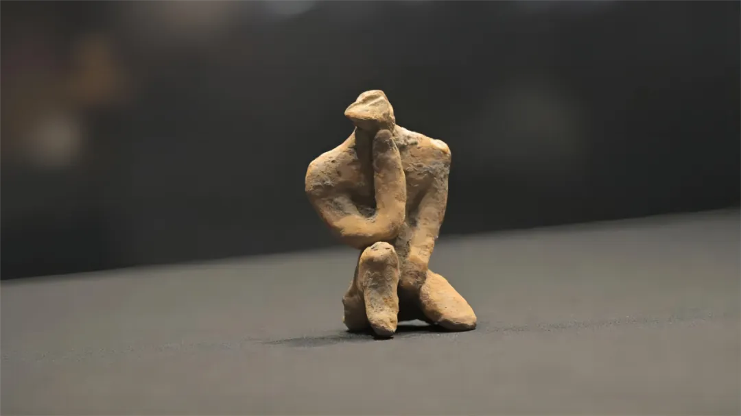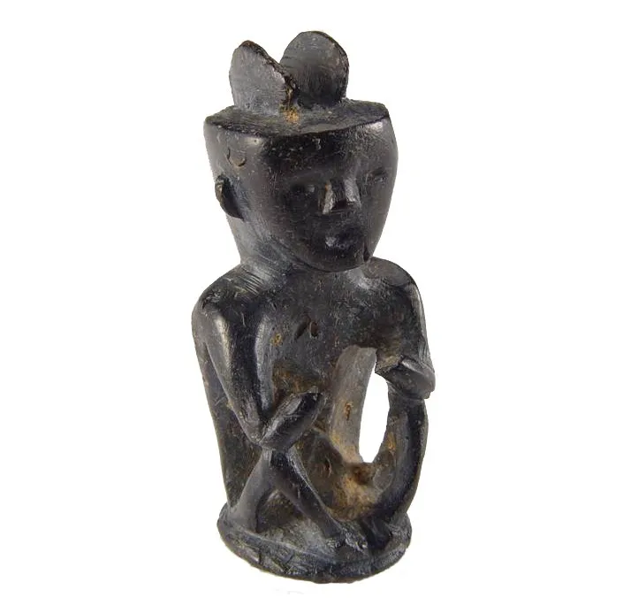 1998年湖北秭归县柳林溪出土。高4.5厘米,宽1.9厘米。色黑,人像蹲坐于圆形底盘之上,双足合拢,膝拱起,双肘支膝,上有双冠。冠侧有一道刻槽,脑后有两道刻槽,腰部扁圆较细,瞠目张舌,手掌和左耳残。这是目前发现的一件时代最早的圆雕人像,人物造型逼真,神态生动,作祈祷状。也许他正在祈求神灵保佑众生平安。