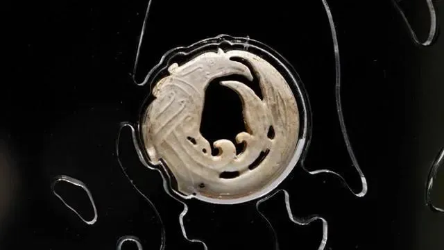 1988年湖北天门肖家屋脊遗址出土,最大径3.8厘米,厚0.8厘米,龙体首尾相卷,呈玦状。龙是中华文化的象征。这种早期的龙的形象是猪嘴蜷躯、有角无足,与北方红山文化的玉猪龙极为相似。