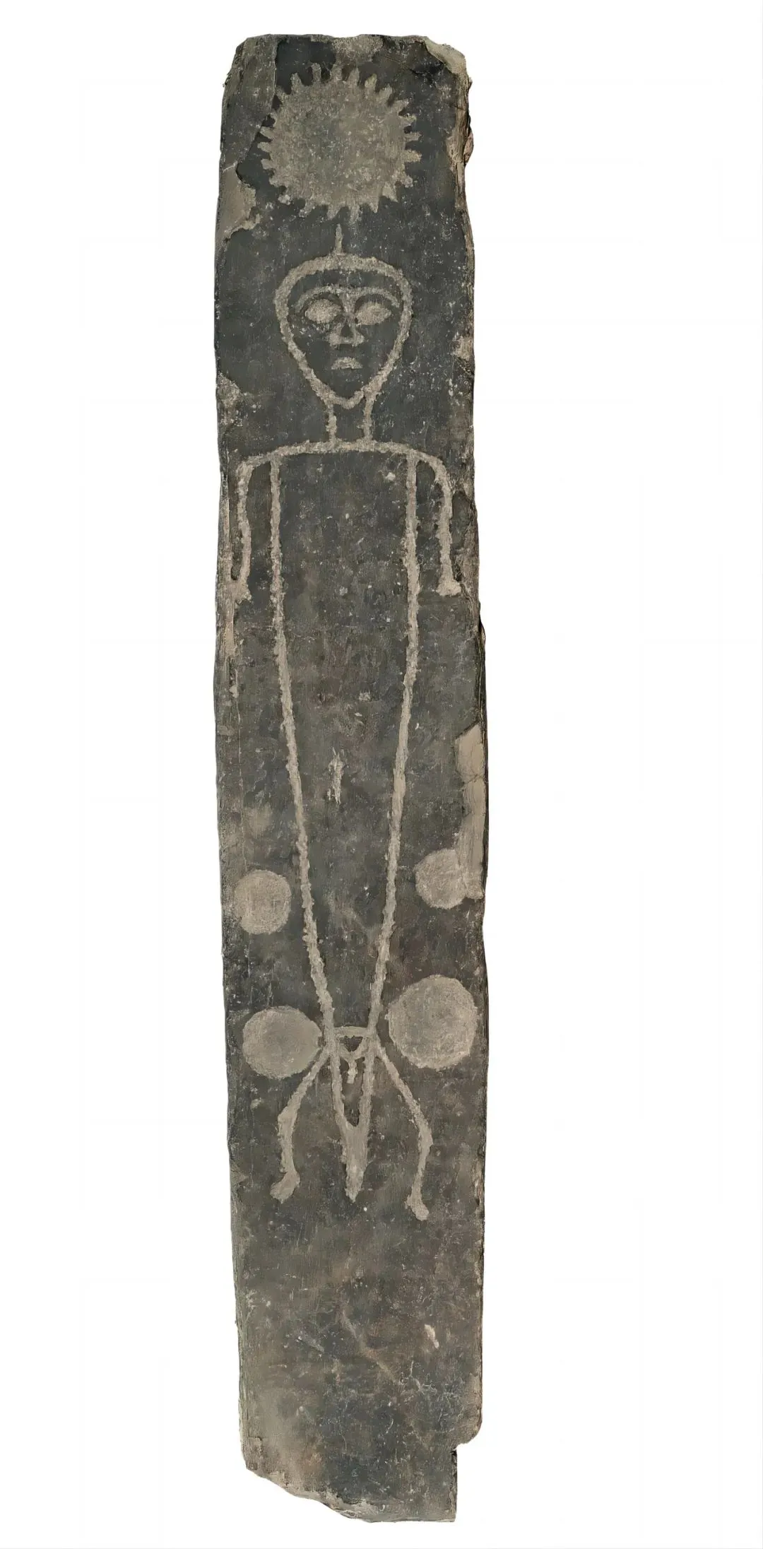 1998年湖北秭归东门头遗址出土。长115厘米,宽20厘米,厚12厘米。“太阳人”石刻图案是刻在一块长方形石条上,石质坚硬,两面平整,正面打磨光滑,线条刻画流畅。用写意的手法雕刻出一位身材修长、两手下垂、双足分立的神人,形体怪异,头顶生一尖角,圆首尖腮,眉弓,双眼硕大,嘴形半月,细颈,平肩,双臂短细,身体上宽下尖瘦长纤细,双腿短小弯曲。神人头顶上刻有23条光芒的太阳,人像腰部两旁分别刻画星辰。神像头顶上的太阳纹居图案首要位置,与神像腰部两边的星辰圆形纹饰相呼应,仿佛相处在同一宇宙中日月星辰景象,烘托出神像的神秘氛围。这幅图案是中国南方迄今所发现年代最早的新石器时代以太阳崇拜为题材的石刻造像,也是目前在我国境内发现最早的一件新石器时代的太阳崇拜图像。