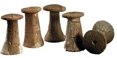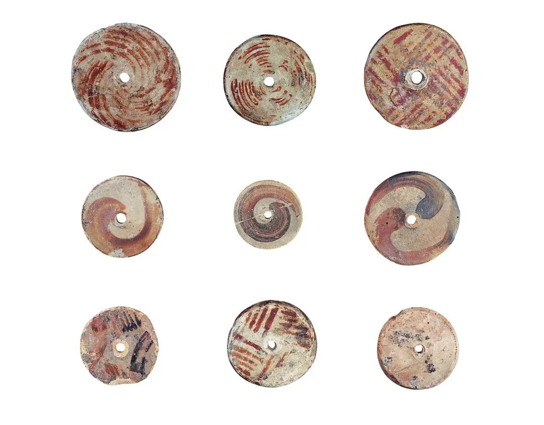 1956年湖北京山屈家岭出土。直径2.6厘米—5.8厘米,厚0.5厘米—0.7厘米。陶纺轮是新石器时代常见的纺织器具。但是屈家岭文化中的彩陶纺轮却非常特别,它的表面饰以橙黄色或红色的陶衣,陶衣薄而均匀,形体都较扁薄规整。彩陶纺轮不仅是纺织工具,也是精美的艺术品,以纺轮的孔径为中心绘制出漩涡纹、弧线纹、直线纹等图案,这些图案对比色强烈,鲜艳夺目,是原始社会珍贵的彩绘作品。其中最引人注意的是有许多类似太极的图形,当纺轮旋转时,这些图案就会产生漩涡状的各种视觉效果,除了美观之外,它还会引起视觉眩晕的效果,使人产生神秘的感觉。