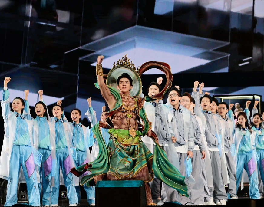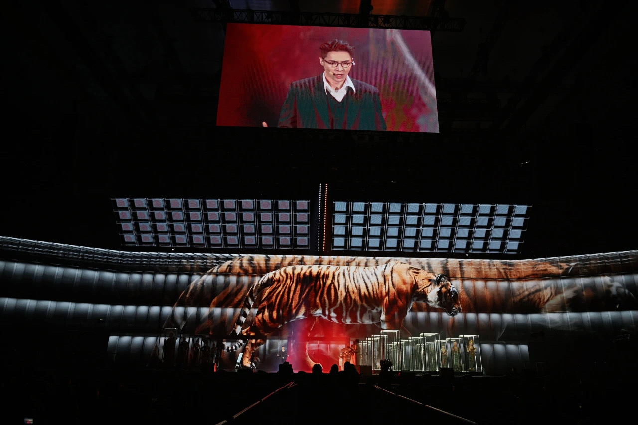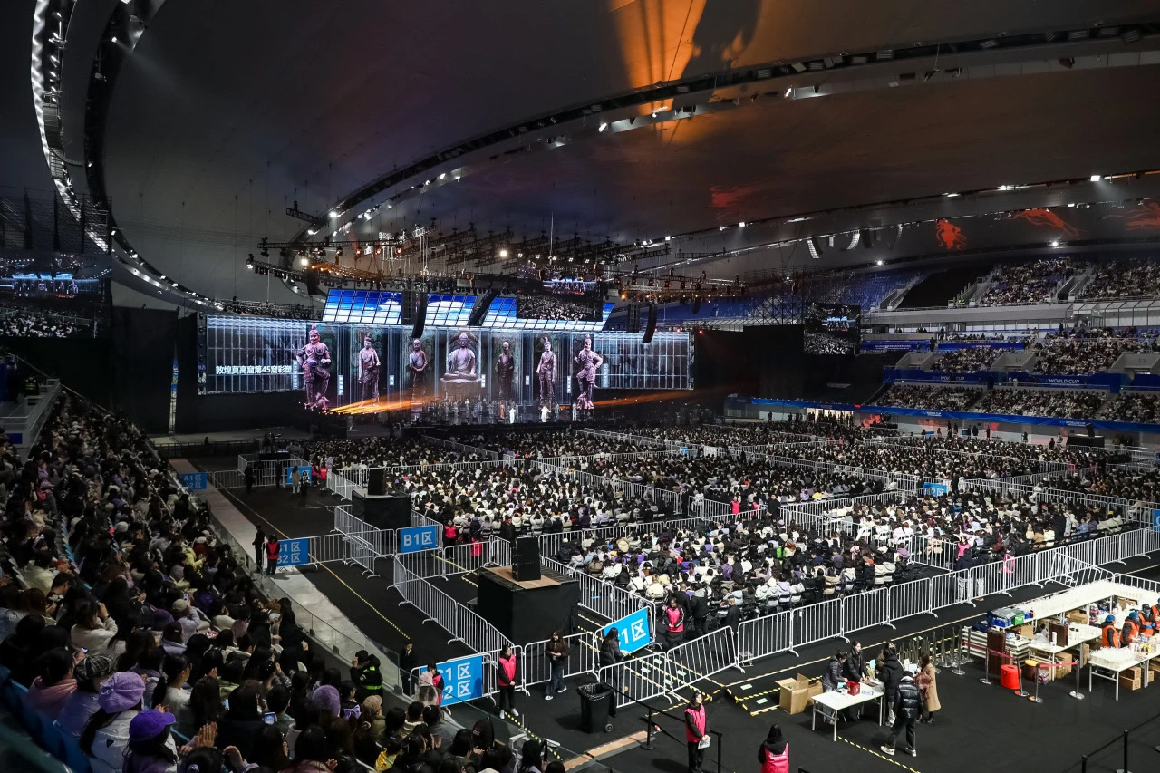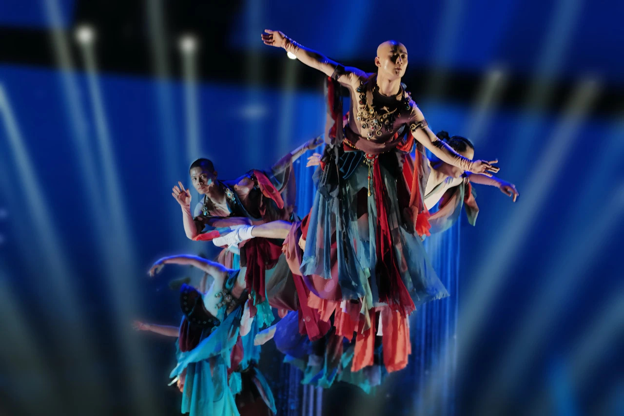 就澎湃新闻记者现场观摩,演出现场足足占据了1.2万平方米赛场面积一半的空间,屹立在赛场中央的多面LED屏更是高至场馆穹顶。创作团队以此打造了多维立体的舞台,并从敦煌的音乐元素出发,大胆拓展戏剧边界,利用原创曲目将古典舞和现代舞融汇,结合7路威亚表演,展示出青春、时尚、未来的舞台质感。