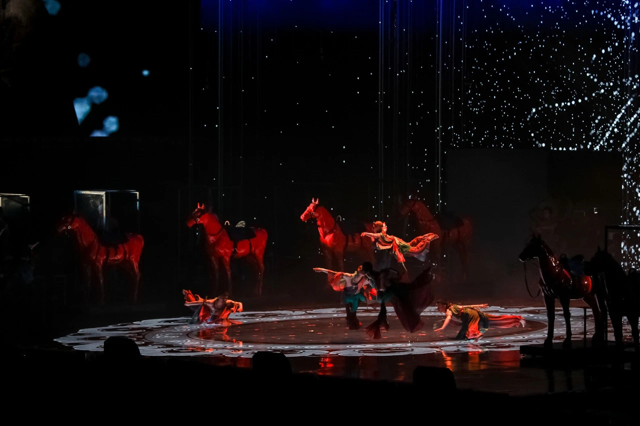 《受到召唤·敦煌》是中国国家话剧院首次在国家级体育场馆内演出的作品。该剧不仅将历史、人文、地理、政治、宗教、艺术等元素共冶一炉,也把话剧、歌唱、舞蹈、威亚、提线木偶等艺术形式进行了创新性整合,通过AI、即时拍摄、多媒体影像、动画真人融合等最新科技手段一并赋能舞台,带领观众沉浸在“戏剧元宇宙”之中。